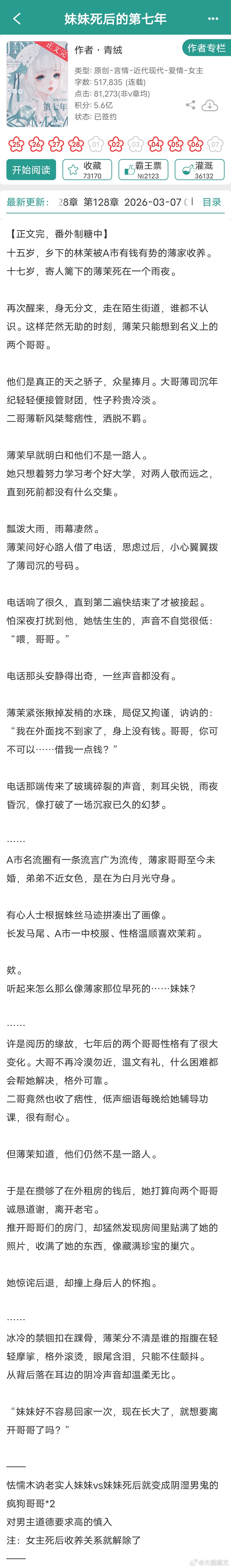 1《染熟》沉让2《婚后第三年她变心了》一枝嫩柳3《洛华春》希昀4《重生之我在杀手家族当厨娘》恶魔奶茶5《阴郁大佬的亡妻回来了》白不欺6《妹妹死后的第七年》青绒7《雾夜梦蝶》浅静8《权嫁》望烟9《贼惦记》泳宁言情小说推荐推文