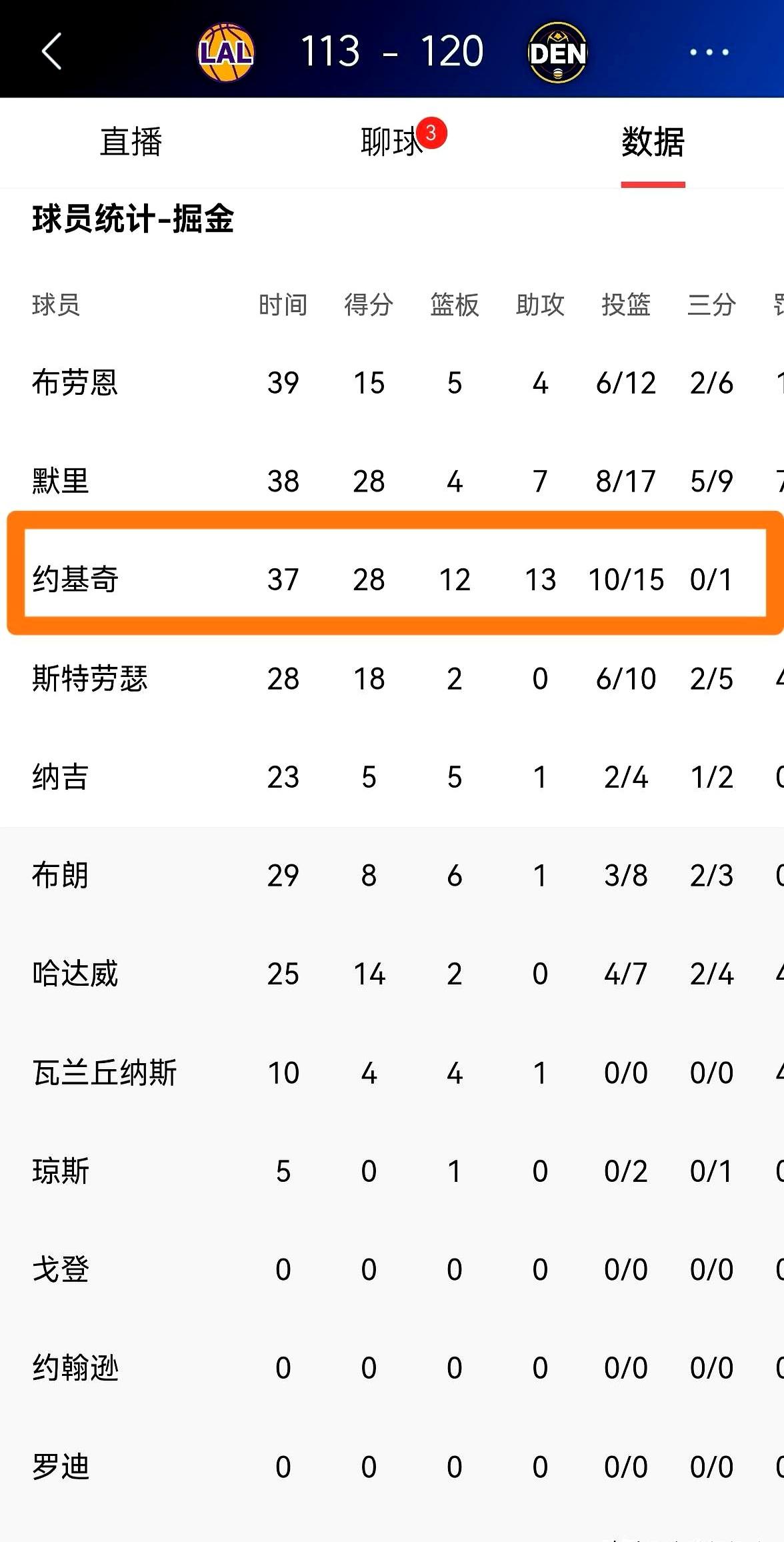 刚刷到热乎的!詹姆斯破NBA历史投篮纪录,湖人还是被掘金按在主场锤爆! 你敢信?约基奇扛了38分钟,15中10轰28+12+13三双,这是他本赛季第23次,罚球8中8全中,哪怕飙到赛季新高的9次失误,末节俩关键上篮直接锁死胜局。 穆雷也爆砍28分,掘金篮板41比32压着湖人打,东契奇拿27+11+7也白搭,老詹后来伤了没力气追分。现在掘金39胜24负,领先湖人1.5个胜场。 是失误里的绝不手软,是破纪录后的落寞不甘,是卡位战的寸步不让——这才是NBA最滚烫的模样!