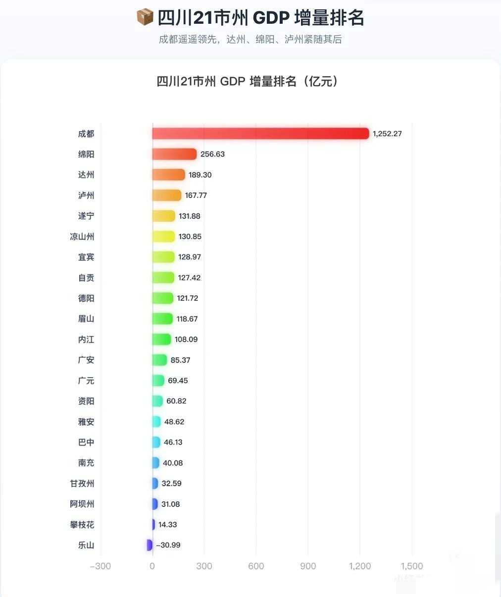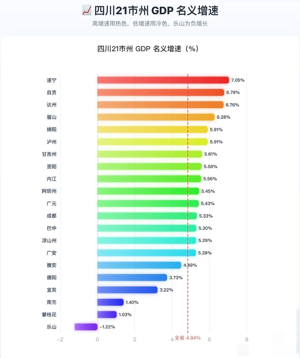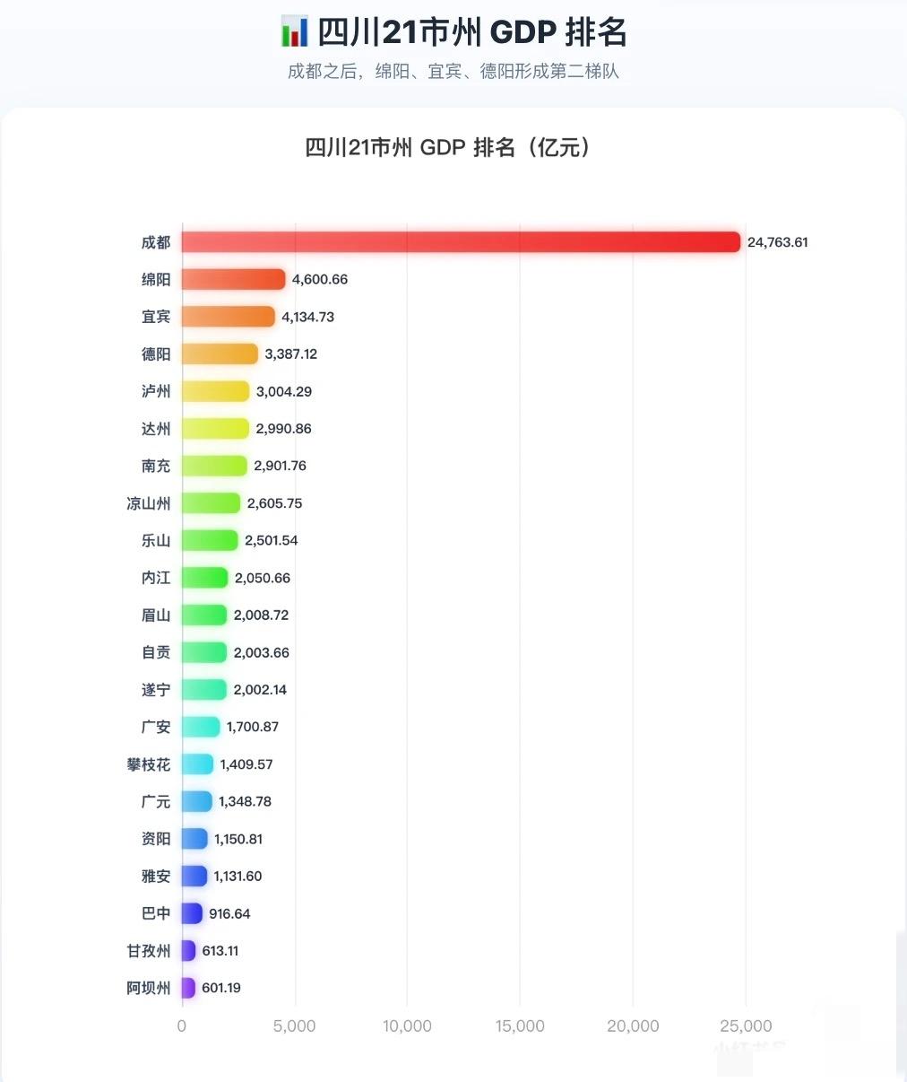 四川不是没有第二城,是第一城太强了。 四川2025年GDP数据出来了。 按21市州汇总,四川今年GDP已经到 6.78万亿,比去年多了 3131亿,名义增速 4.84%。 但这份榜单最吓人的,还是成都。 成都GDP 24763.61亿,占全省36.5%。 什么意思? 差不多全四川三分之一的经济总量,都在成都一城。 而且成都后面,第二名绵阳只有 4600.66亿, 这个差距不是领先,是断层。 不过四川真正有意思的,不只是总量,而是增速。 全省跑得最快的前三是: 遂宁 7.05% 自贡 6.79% 达州 6.76% 反倒是乐山,今年成了少见的负增长城市,增量 -30.99亿,名义增速 -1.22%。 所以四川现在的格局很清楚: 成都继续一骑绝尘,绵阳宜宾德阳争第二梯队,后面一批城市正在拼命追。 你觉得四川未来的第二城,到底稳不稳?