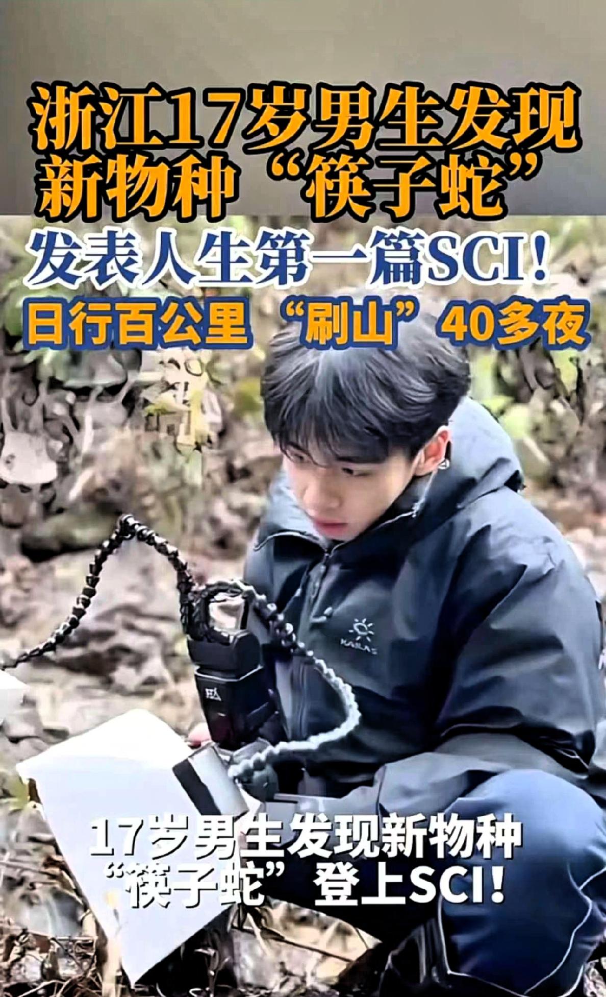 这还真是山外有山,人外有人!浙江一个才17岁的男生,没事就天天往山上跑,竟然意外的发现了一种叫“筷子蛇”的新物种,相关研究成果发表在国际学术期刊上,用实际行动诠释了普通人也能在热爱的领域做出价值。 他并非专业科研人员,也没有特殊背景,只是一名对自然生物充满兴趣的普通学生。在课余时间里,他常常主动前往山区进行观察记录,为了确认一种体型纤细、形态特别的小蛇,连续四十多个夜晚坚持进山,耐心寻找、细致比对、认真记录,一步步积累下可靠的野外资料。正是这份踏实与坚持,让一种从未被正式记载的物种,最终得到学术界的认可。 这件事最让人触动的,不是所谓“天才少年”的传奇,而是一个普通人靠专注与踏实做成一件有意义的事。现实中,不少人觉得年纪小、条件普通就难以有所作为,甚至把兴趣当成消遣,不愿长期投入。而这位少年用行动说明,真正推动人前进的,往往不是天赋和资源,而是持续的热爱与不轻言放弃的态度。 科研发现从来不是遥不可及的事,它也可以来自普通人日复一日的认真与积累。不浮躁、不功利,把一件小事做深做细,同样能产生实实在在的价值。 少年的成长,不只在于成绩,更在于有方向、有耐心、有责任感。这样踏实努力、尊重自然、坚持热爱的年轻人,值得我们肯定与鼓励。 一个人的力量虽小,但认真与坚持,总能在不经意间带来惊喜。