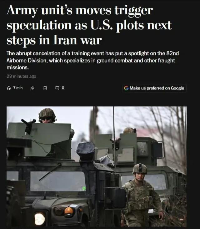 美国《华盛顿邮报》报道称,美国陆军突然取消了第82空降师的一次重大训练演习。外界猜测美国可能要把这支精锐地面部队派到中东地区。 老特这是继续豪赌,空中力量打不垮伊朗,那就加码上地面部队。但是一个空降师是远远不够的,后续看老特会不会投入更多的地面部队。
