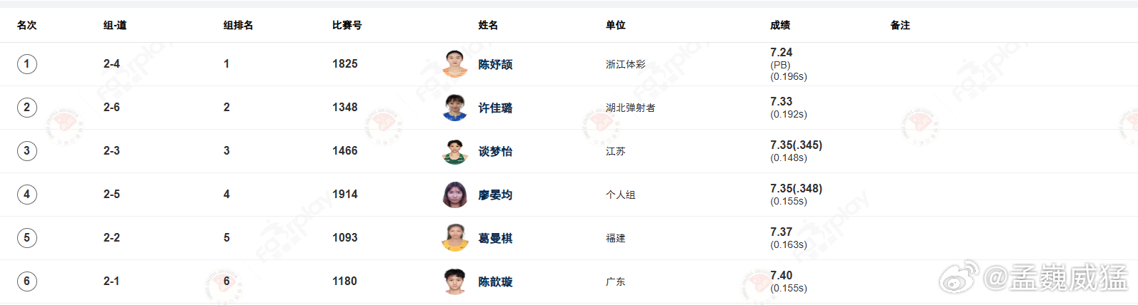 陈妤颉此前的个人最佳是去年在济南站跑出的7秒26,位列该项目国内历史第八位。