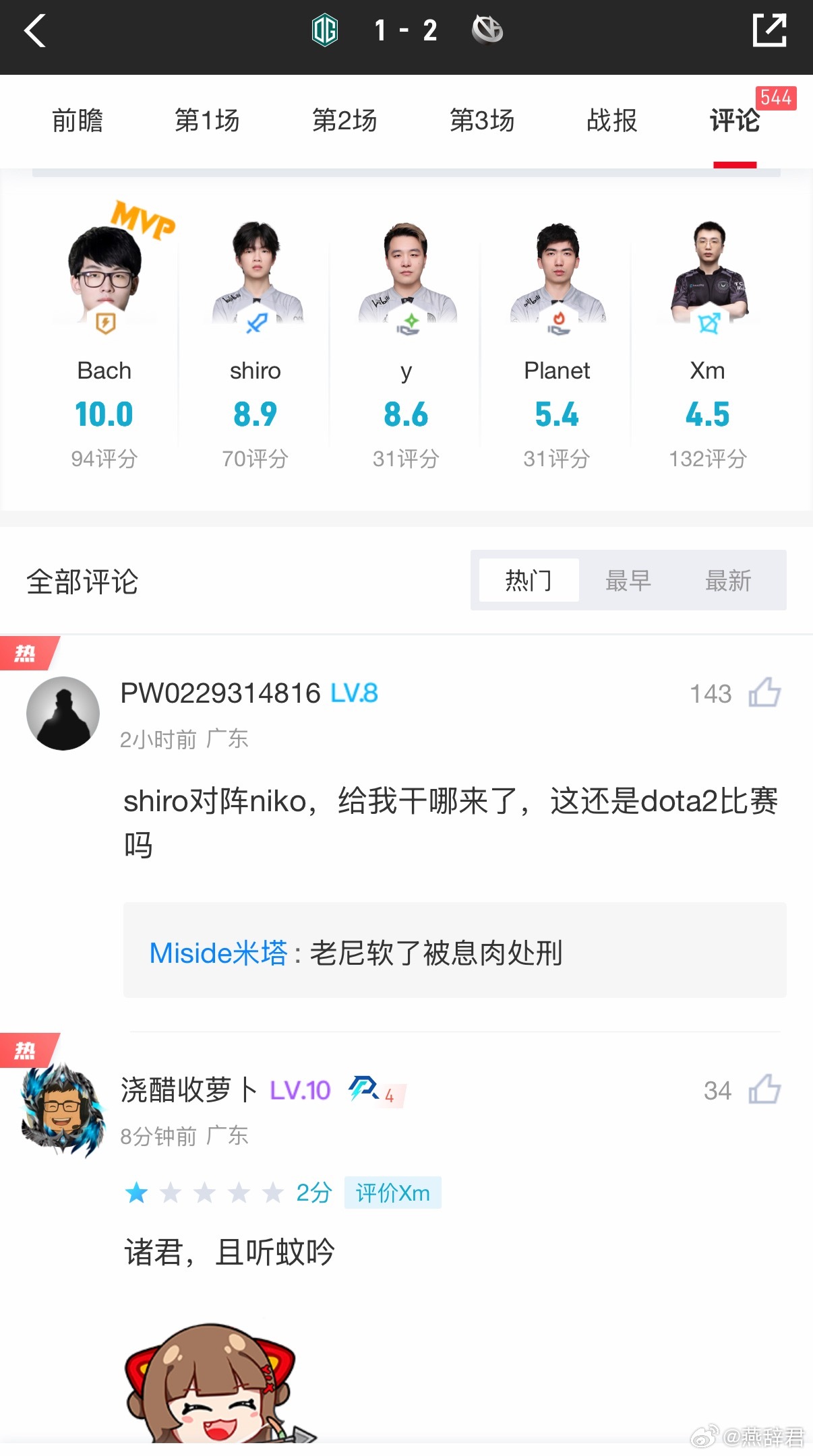 VG对OG赛后评分,巴哥满分,Shiro8.9分,讲道理两把赢的比赛都是Shiro又带节奏又打输出,值得一个满分啊,毛哥则是表现不佳,4.5最低分dota2