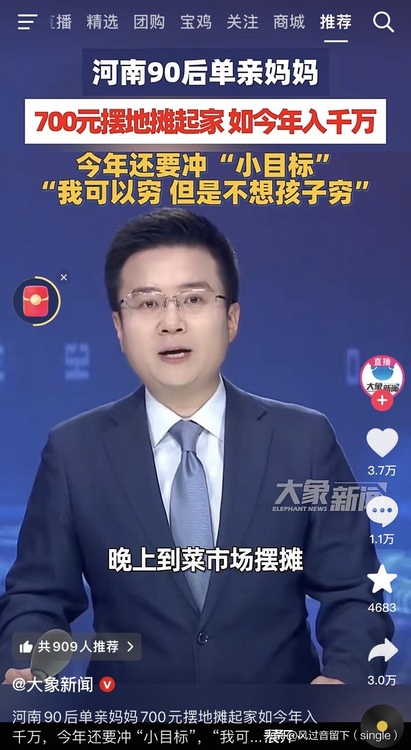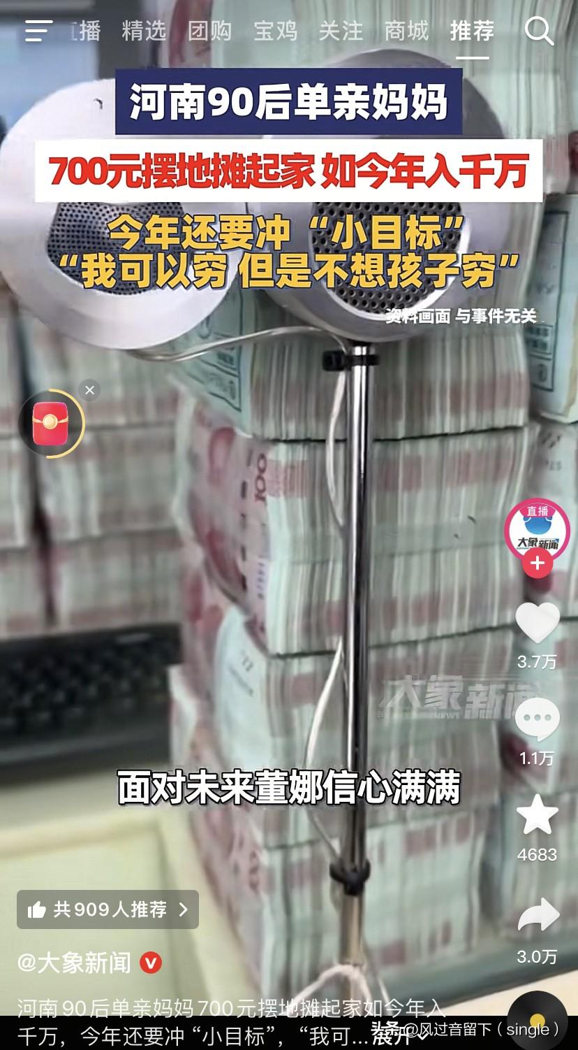 700块在十几年时间变千万,厉害了! 90后河南单亲妈妈,700块摆地摊起家,租了10平米的房子,每天只睡三四个小时,太疯狂了! 早上五点多回去进货,晚上在菜市场摆摊! 这么疯狂,年入千万了,她今年的目标就是一个“小目标”,自己可以穷,不能穷娃。 看来女本柔弱,为母则刚!为了生活的更好,她真是拼了!祝愿她和她的孩子生活越来越好!