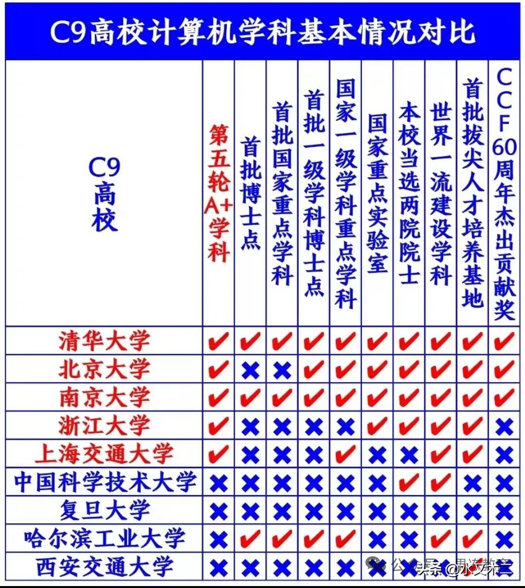C9高校计算机学科多维度对比下,南京大学可谓毫无短板,与清华大学成为当之无愧的TOP2,即便是北京大学也要稍逊一筹,而同为华东五校的浙江大学和上海交通大学虽然第五轮学科评估也是A+,可惜差距仍是极为明显。至于中科大、复旦、哈工大和西安交大甚至在学科评估中都没能拿到A+,就更是难以与南大匹敌了!