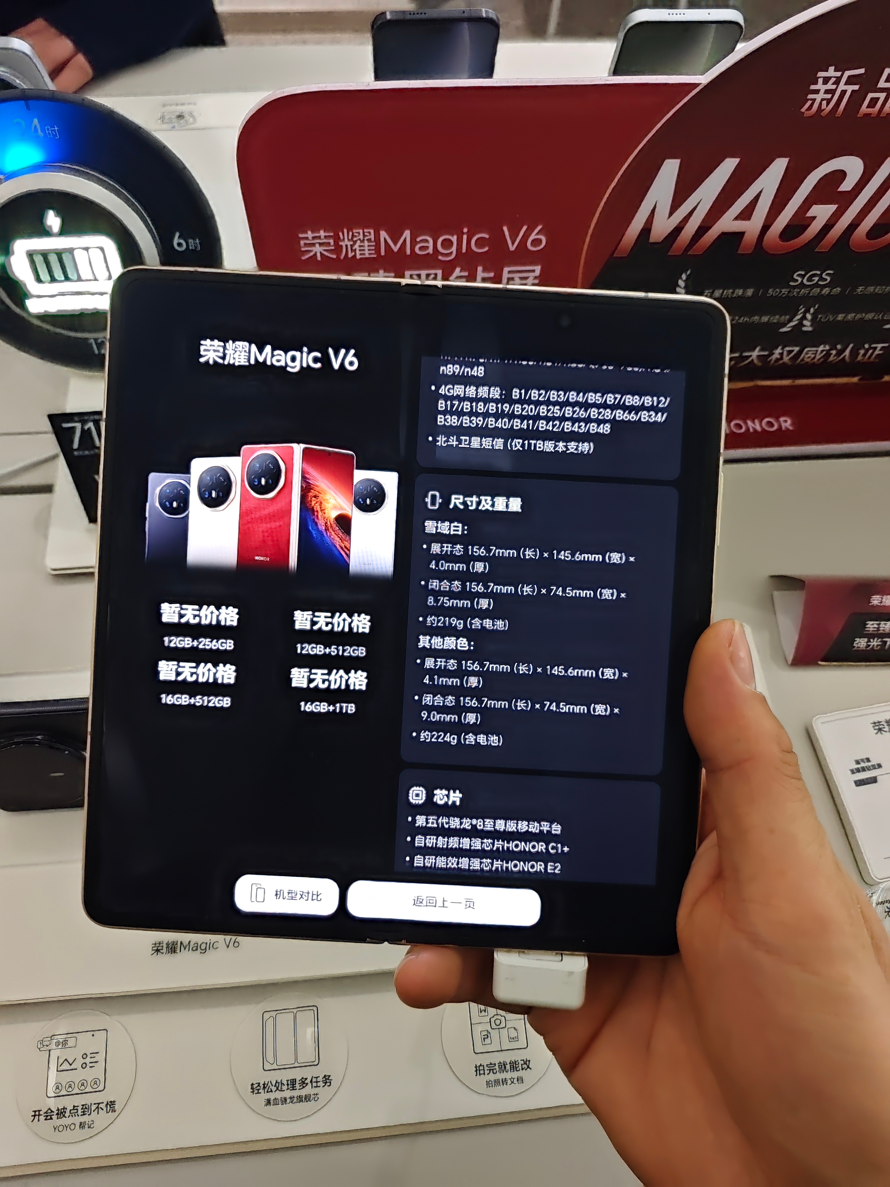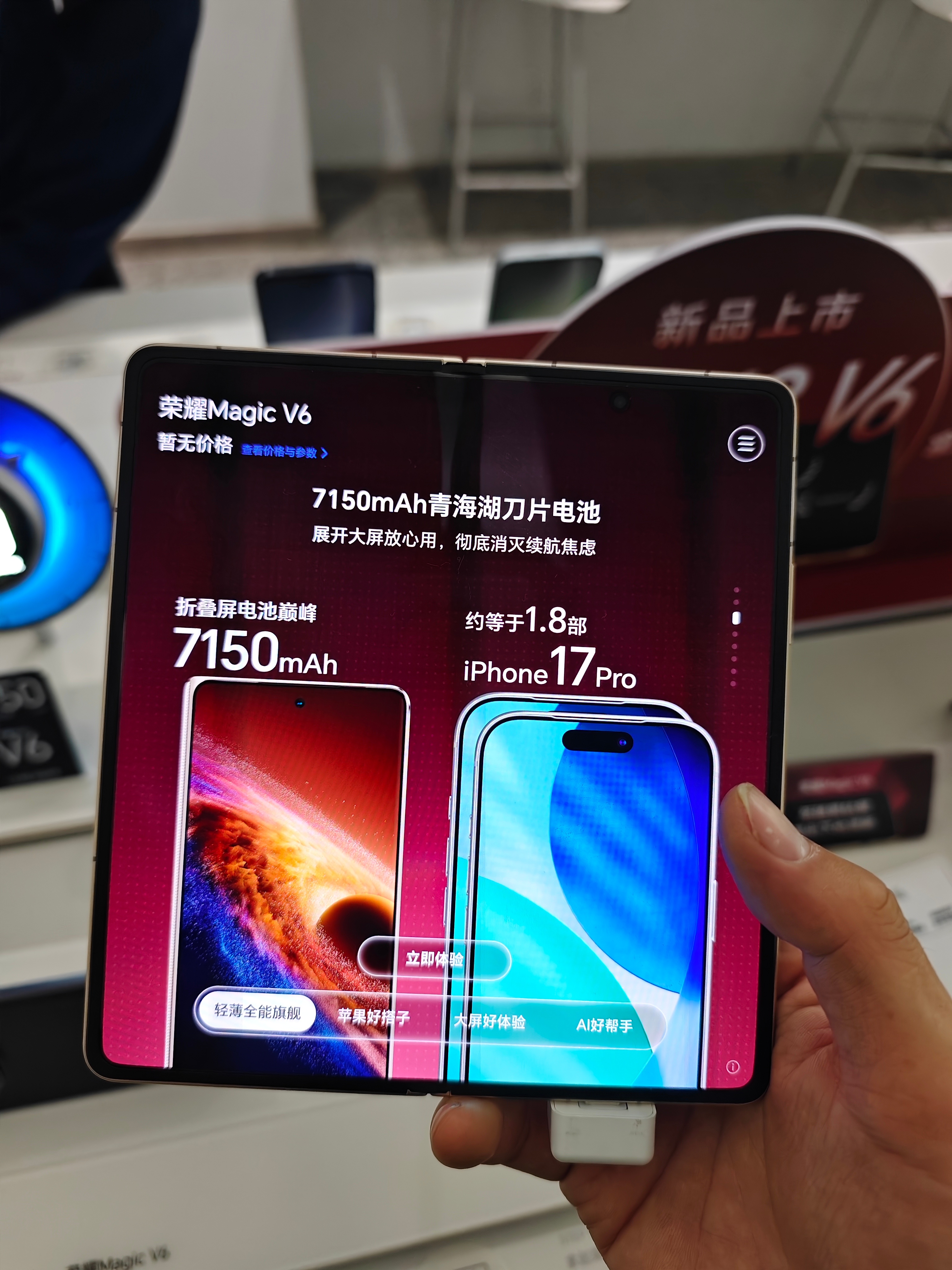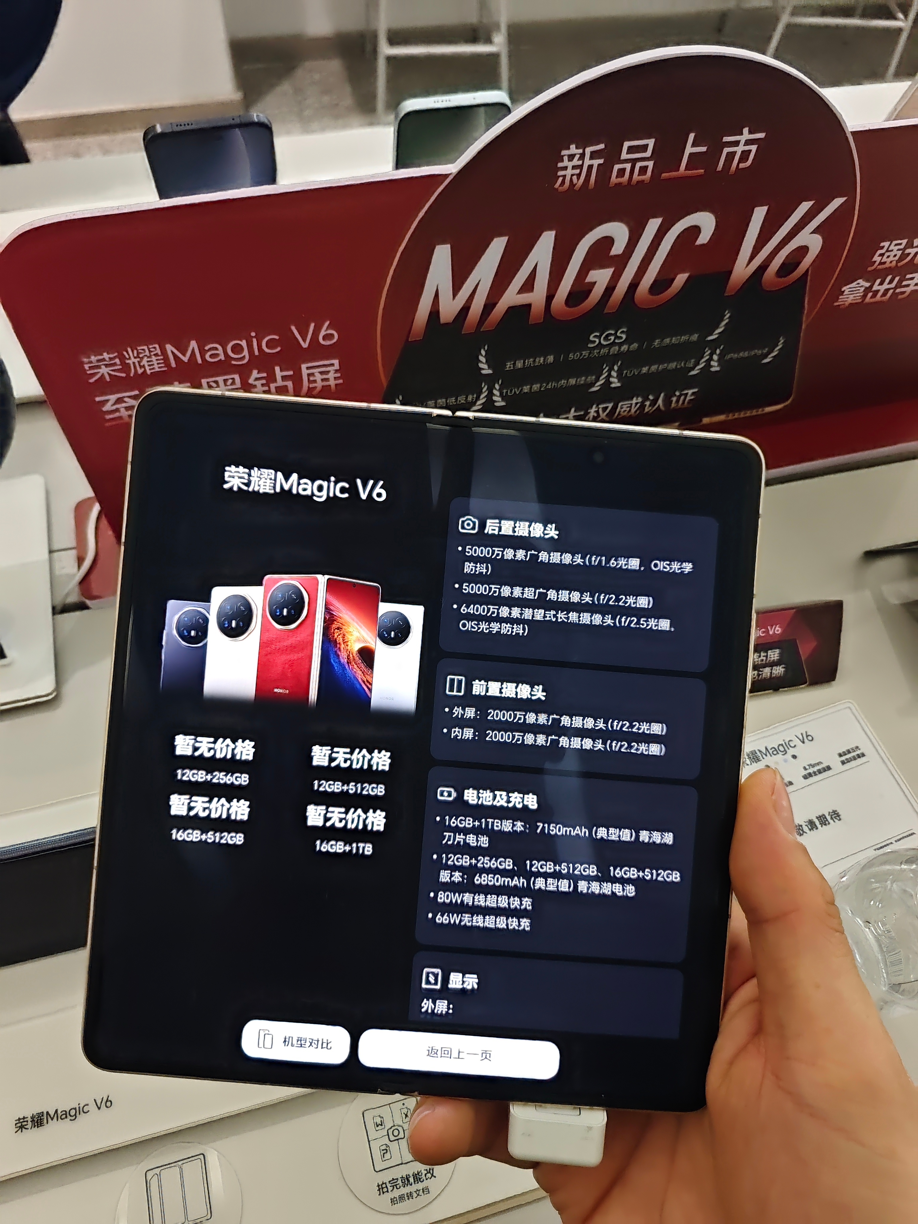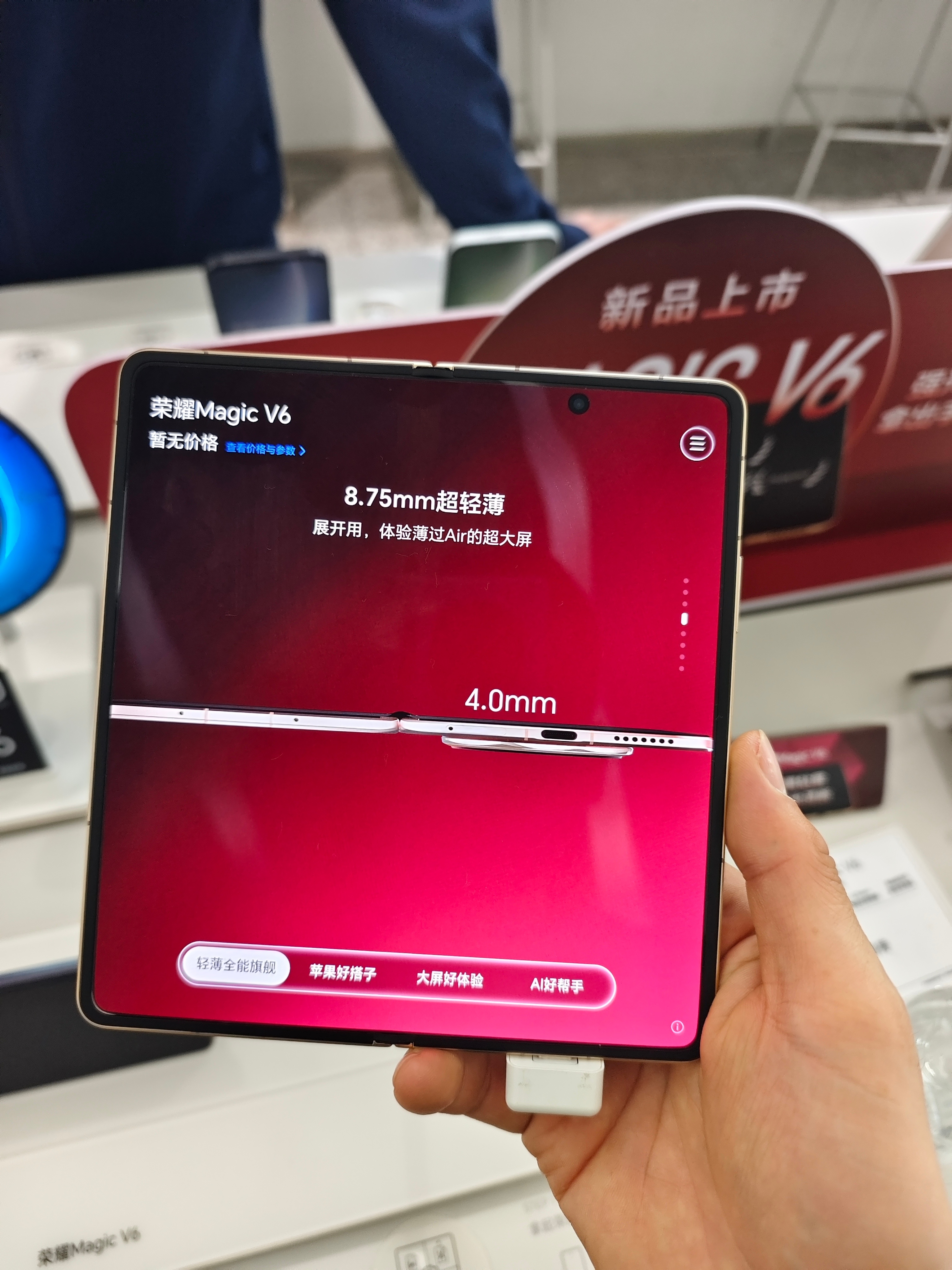 刚在店里摸了一下荣耀Magic V6三个配色的真机,一如既往地薄,1TB顶配版本才是7150mAH电池,4mm纤薄机身蕴含大能量,“细枝结硕果,不是科技就是狠活”电池能做这么大确实厉害。折痕侧面看还有依稀痕迹,但摸起来基本平整,折痕控制已经是很好了,第五代骁龙8至尊版芯片,还有防水,三摄这次产品力很足。当然更多的升级应该是在系统内部,新的三分屏交互,包括相机里新增的丰富滤镜,这次新机是由内到外的全方位体验提升。当然,价格肯定要涨价了,会不会9999起售-11999?