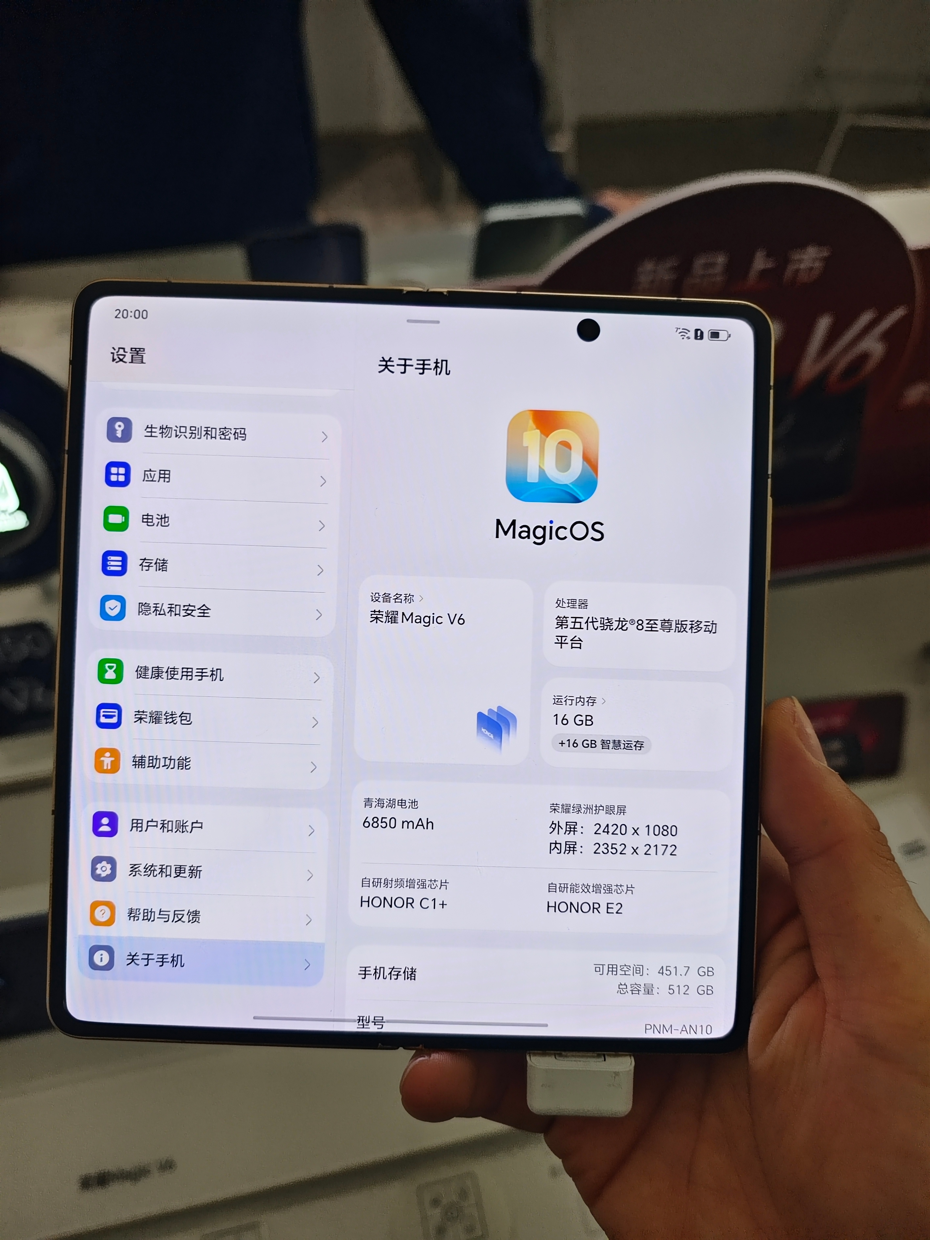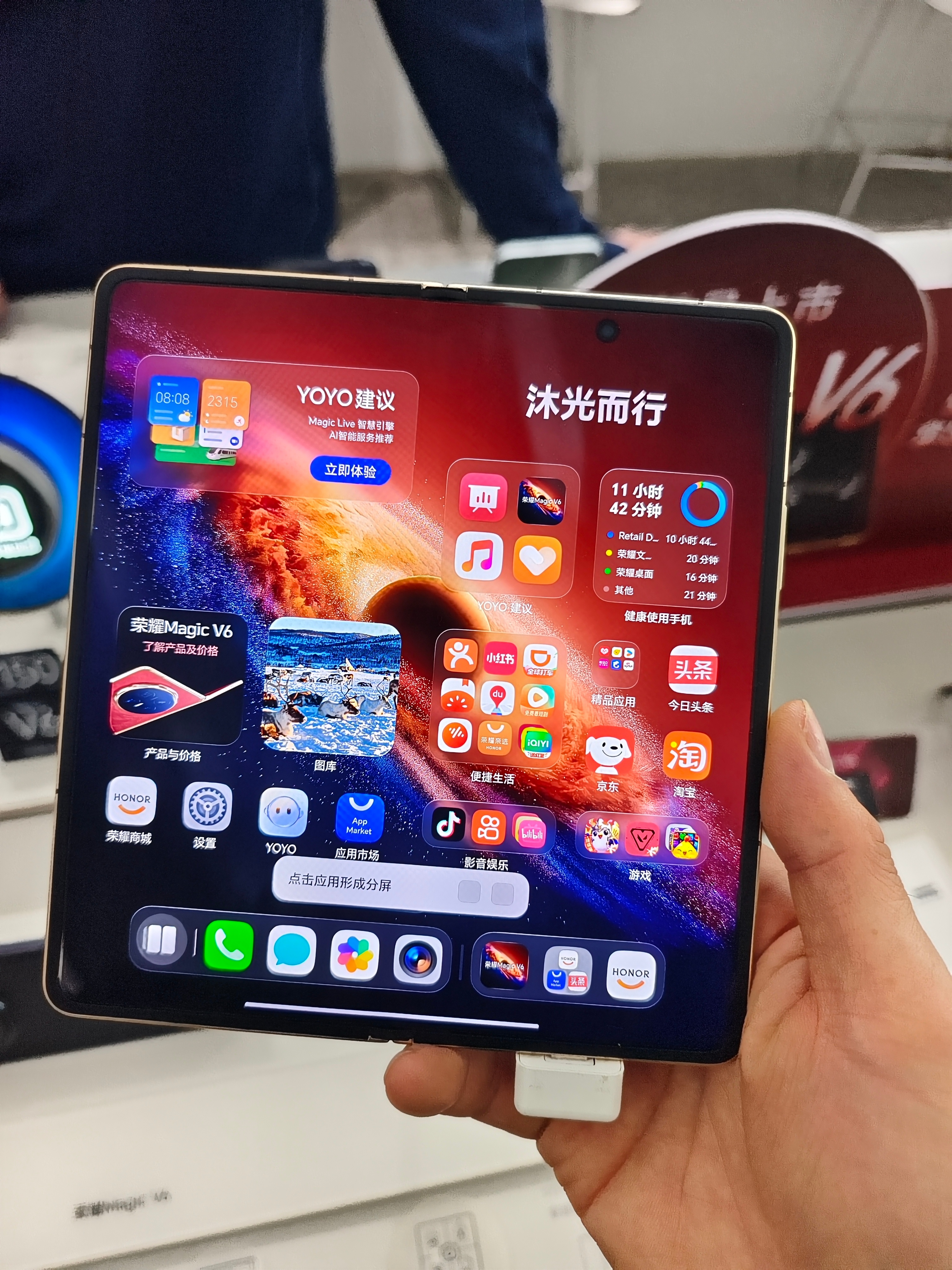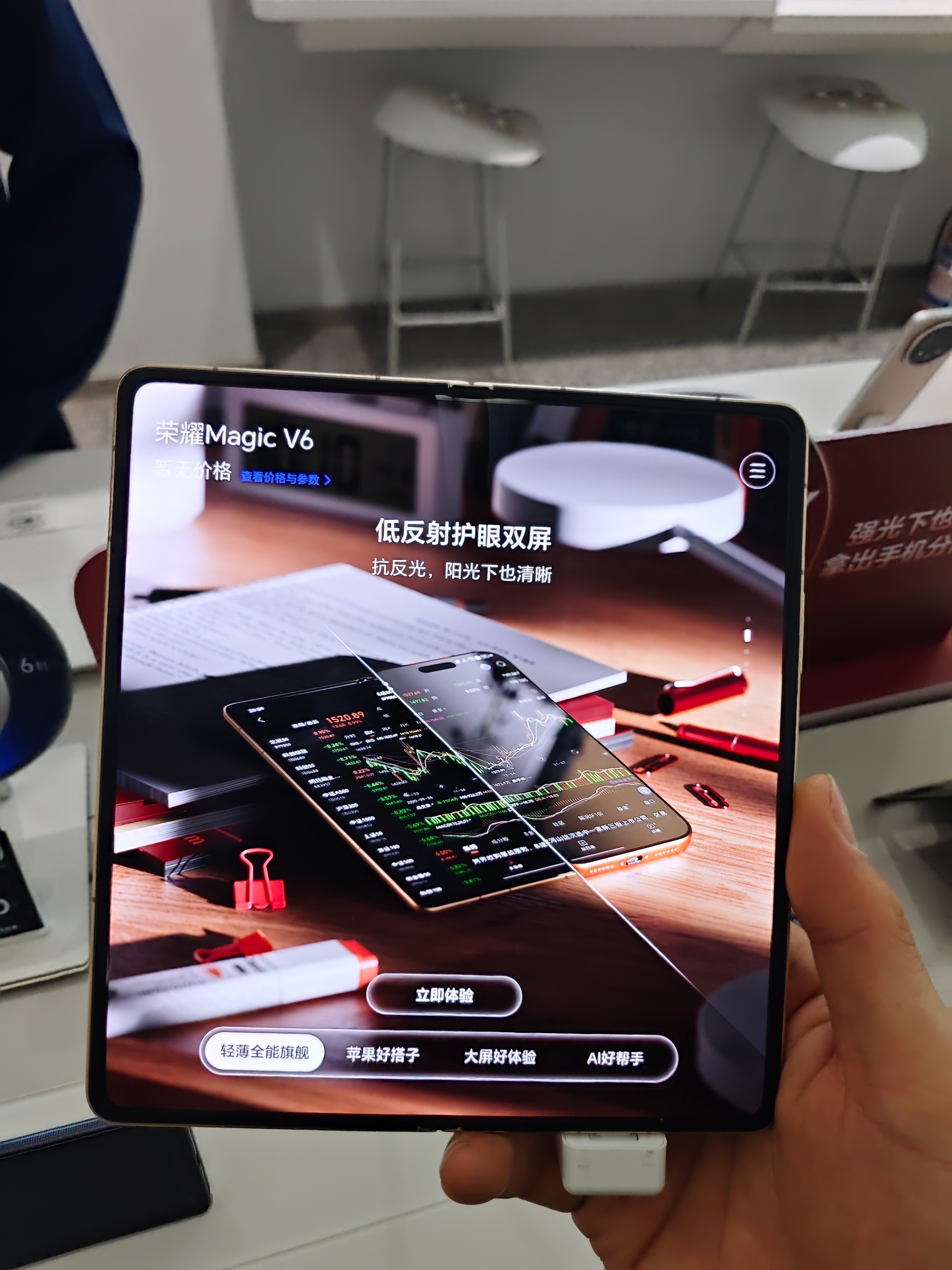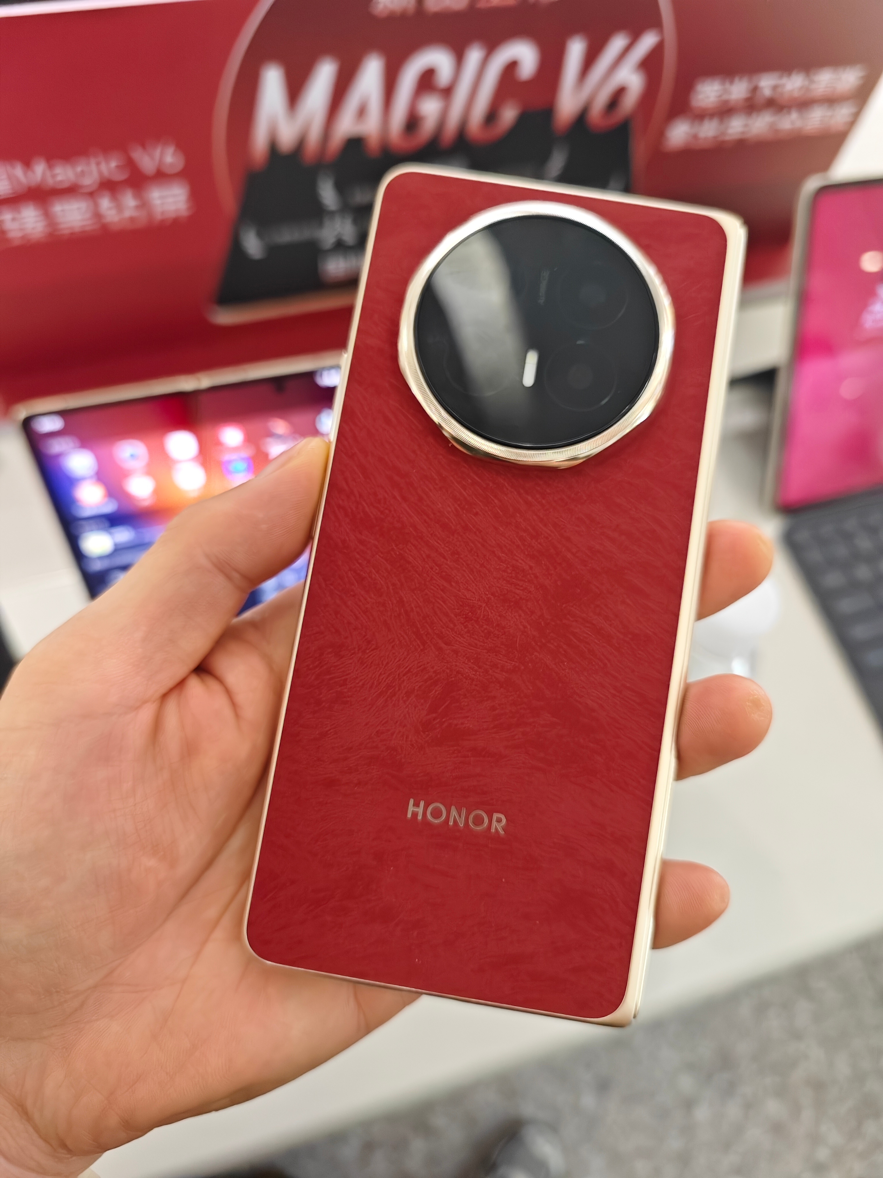 刚在店里摸了一下荣耀Magic V6三个配色的真机,一如既往地薄,1TB顶配版本才是7150mAH电池,4mm纤薄机身蕴含大能量,“细枝结硕果,不是科技就是狠活”电池能做这么大确实厉害。折痕侧面看还有依稀痕迹,但摸起来基本平整,折痕控制已经是很好了,第五代骁龙8至尊版芯片,还有防水,三摄这次产品力很足。当然更多的升级应该是在系统内部,新的三分屏交互,包括相机里新增的丰富滤镜,这次新机是由内到外的全方位体验提升。当然,价格肯定要涨价了,会不会9999起售-11999?