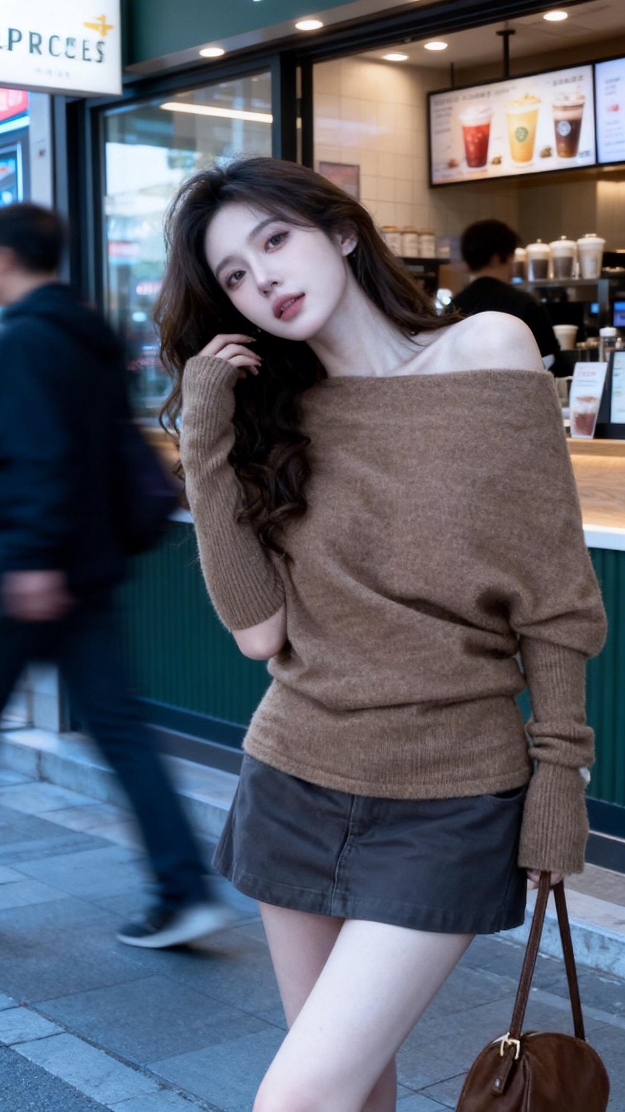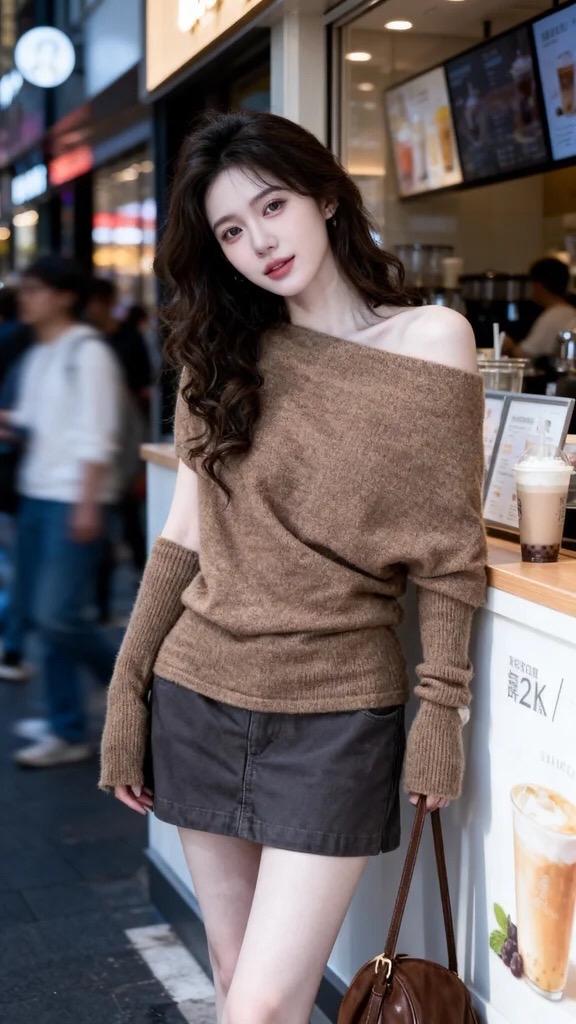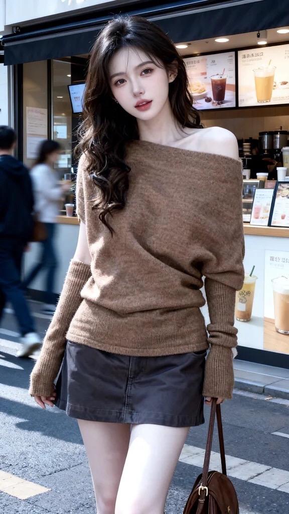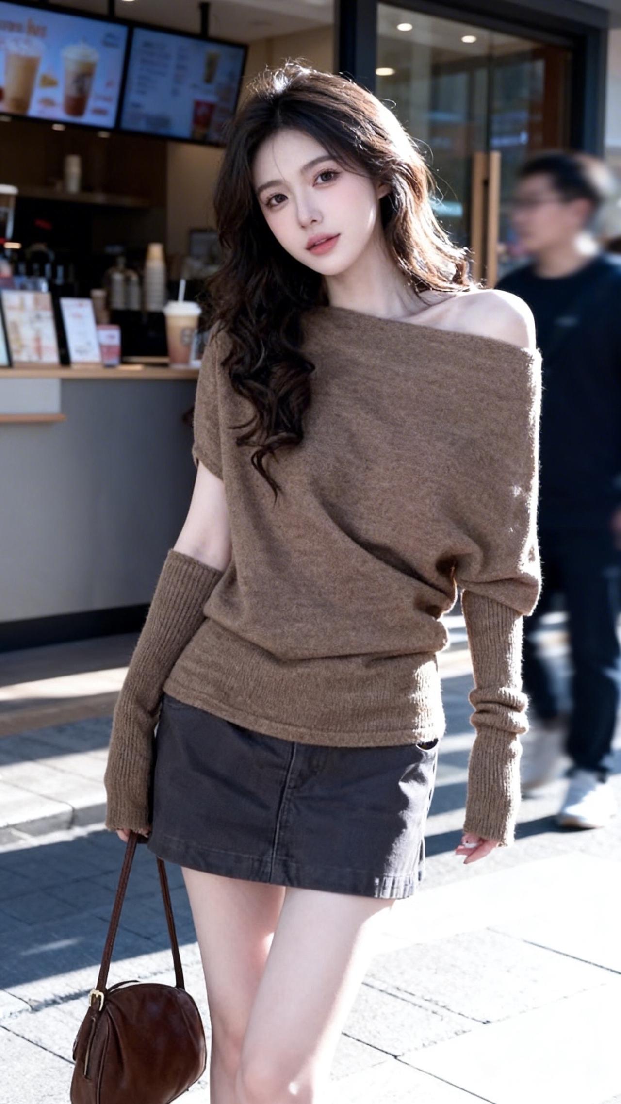 韩搭 韩系穿搭 韩风穿搭 漏肩穿搭 棕色系穿搭