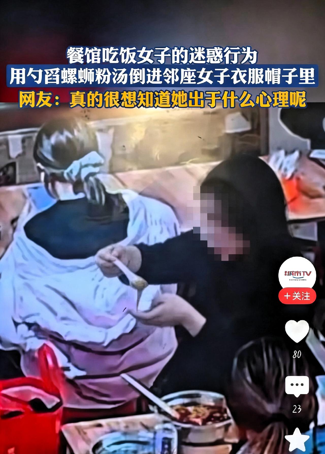 餐馆里,黑衣女子偷偷将自己碗里的螺蛳粉红汤,用勺子舀进了邻座女子的羽绒服帽子里。整个过程动作平静,却给他人带来了不小的麻烦。 等对方用餐结束,戴上帽子离开时,积攒在帽中的红油汤直接洒在头发和衣物上,不仅狼狈不堪,还会严重影响后续的安排。如果接下来有面试、见客户或重要约会,都会因此受到影响,原本正常的一天被无端打乱,心情和状态都会大打折扣。 从现有情况来看,两人并没有明显的激烈矛盾,黑衣女子的行为更像是出于一时的负面情绪,选择用隐蔽、不体面的方式发泄。这种做法既不理性,也缺乏基本的公德心,看似小事,实则越过了人与人相处的底线。 真正体现一个人素养的,往往是无人注视时的行为。当面不争执、背后使小动作,看似“聪明”,实则暴露了心胸狭窄、情绪管理薄弱的问题。这样的处事方式,只会让身边的人逐渐疏远,恋人难以安心,同事保持距离,长期来看,损害的是自己的人际关系和口碑。 生活中难免有小摩擦,合理沟通、互相包容才是正常的相处方式。恶意报复、暗中伤人,解决不了问题,只会制造更多矛盾,既伤害他人,也拉低自己。 出门在外,多一份体谅,少一点恶意,于人于己都更安稳。