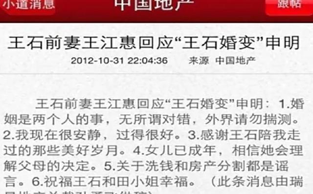 2012年10月王石前妻王江惠发表声明:祝福王石和田小姐幸福。 在地产圈里,王石这个名字总让人联想到登山和商业传奇,可谁想到2012年10月,他的私人生活突然成了热点。前妻王江惠的一份声明冒出来,里面居然祝福王石和田小姐幸福。这事来得突然,让人忍不住猜:离婚背后到底有啥隐情?这份声明是真大度,还是另有故事? 王石这个人,大家都知道他是万科的创始人,1951年出生在广西柳州,1974年进了兰州铁道学院学给排水,毕业后去广州铁路局干技术员。1983年他娶了王江穗,俩人婚后生了个女儿,王江穗一直低调,帮着打理家务,支持王石南下深圳创业。 从贸易起步,万科慢慢做大,成了地产巨头。田朴珺是1981年生,俩人差30岁,这事一出就炸锅了。 这事得从2012年秋天说起,地产行业那会儿正热闹,王石的离婚传闻突然冒头。微博上有个叫“慈冰CAIJING”的网友爆料,说王石和王江穗年内离了,还可能净身出户。新欢是田朴珺,那时候她刚演完《甄嬛传》里的敦亲王福晋,挺出名的。 传闻一出,万科内部人士也证实,俩人去年就分了。田朴珺和王石的恋情早有迹象,2008年就有报道说俩人一起出现。离婚协议后来被曝出来,10处房产7处归女方,王石给了不少财产,但不是净身出户。 离婚原因没明说,但王石后来回应说家庭是社会基石,每个家庭有自己的故事,让人尊重隐私。王江穗的声明就是在这时候出来的,她没骂人,没闹腾,就平平静静说那些话。社会上离婚案多,原配骂小三的比比皆是,但她选择祝福,这点让人觉得她活得明白。 不爱了就分手,别搞得鸡飞狗跳。声明还否认了转移资产的说法,说不是技术性离婚。整个事件,王石保持低调,没多回应,田朴珺也沉默。媒体追着问,万科股价那会儿有点波动,但没大影响。 这声明的也细节挺有意思,王江穗列了6点,第一点说婚姻无对错,外人别猜。第二点自己过得好。第三感谢王石那些年。第四女儿成年会懂。第五否认洗钱和房产分割谣言。第六祝福王石和田小姐。 王江穗离婚后没再婚,过低调日子。女儿在美国独立了,回国少。但王石形象有点影响。地产大亨离婚,本来常见,但王石这人一向硬汉形象,这次私人生活曝光,让人看到另一面。社会上对年龄差大的恋情有争议,有人说不合适,有人觉得这是个人选择。