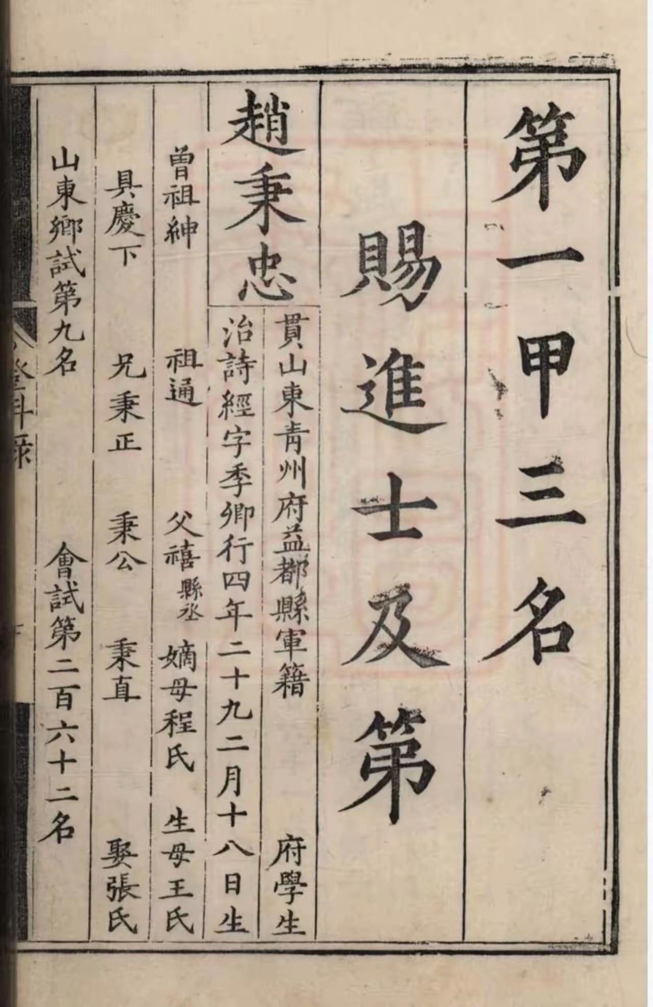 谁知道这是什么资料?我记得历史上赵秉忠是明万历年间的状元,怎么这里成了一甲三名,这就是探花了。而且写的是赐进士及第,不就是赐进士出身吗?应该写进士及第。最起码这资料不权威。