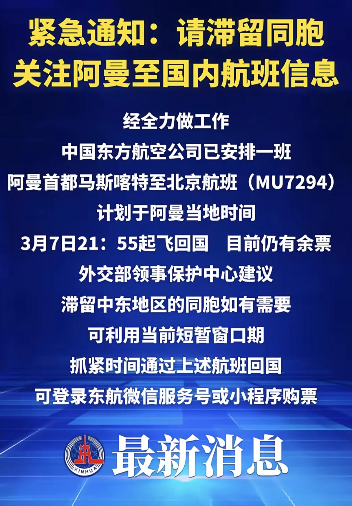 新华社紧急提醒!中国东方航空公司已安排一班阿曼首都马斯喀特至北京航班(MU7294),同胞们抓住机会,目前仍有余票,赶紧回来吧,不要再错过了,生命宝贵!滞留的同胞一定要关注航班信息! 因为有强大的祖国,所以才有小小的我,祖国强大,人民幸福,为伟大的祖国点赞!