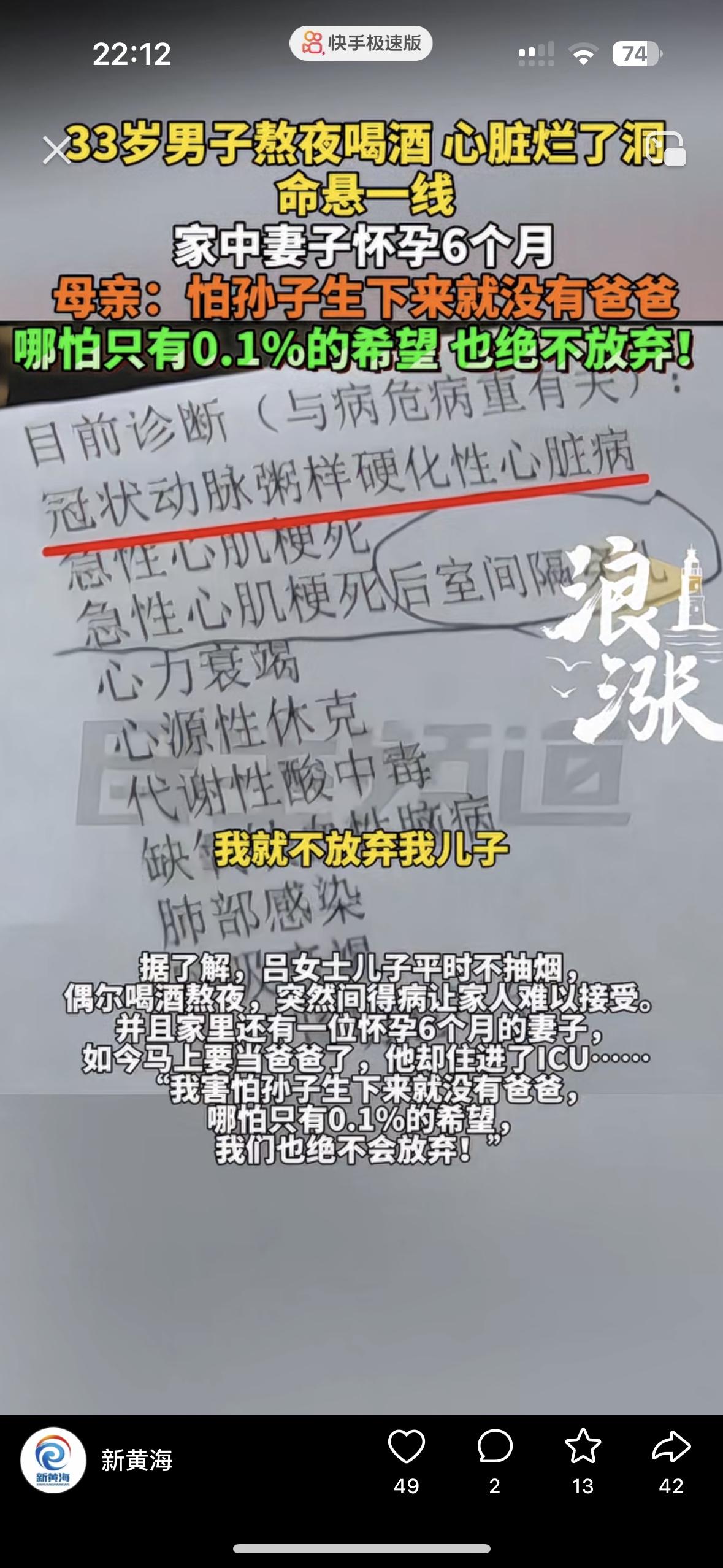 太让人崩溃了!谁能想到?一个33岁的准爸爸前一天晚上还在熬夜喝酒,第二天就被送进了ICU,病情严重的连医生都直摇头 年迈的妈妈怎么也想不到,儿子说肋骨疼,她以为只是累着了,可她赶到医院却被诊断书上的字惊到了,急性心肌梗死,心力衰竭……更让她感到绝望的是,儿子的心肌已经发黑坏死 而此时儿媳妇怀孕6个月了,肚子里的宝宝在有3个月就要出生了。奶奶哭着说哪怕只有1%甚至是0.01%的希望也绝不放弃,不想孩子一生下来就没爸爸 没人觉得33岁这么年轻的年纪会血栓堵死血管,事实上熬夜和酒精都是帮凶,上有老下有小的年纪,一定要好好爱惜自己!一旦倒下了,一个家就完了