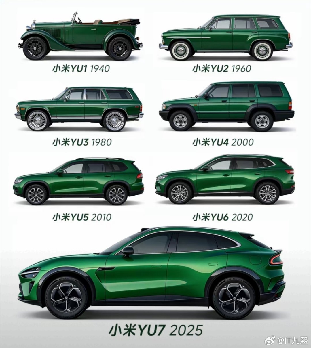 网友用AI生成“小米汽车百年发展史”,以宝石绿为主色调,串联起从1940到2025的车型谱系。