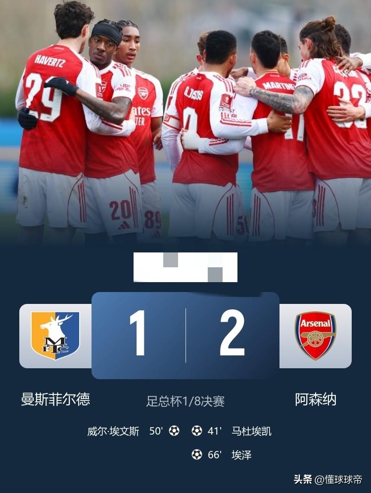 差点翻车,阿森纳2-1惊险战胜英甲球队晋级足总杯八强! 在刚刚进行的一场足总杯比赛中,阿森纳的对手是英甲排名第16位的曼斯菲尔德,阿森纳全队身价高达12.7亿欧元,而曼斯菲尔德全队身价只有823万欧元,两队总身价相差154倍。 要知道阿森纳身价最低的球员是700万欧元的凯帕和900万欧元的诺尔高,其余球员身价全都超过1000万欧元,连16岁的道曼身价都高达2000万欧元,因此可以说一个最弱的阿森纳球员都能抵得上对手全队了。 因此阿森纳轮休了大部分主力,甚至让16岁的道曼首发出战,本以为可以轻松拿下比赛,结果万万没想到差点翻车,最终2-1惊险战胜对手晋级八强,把阿森纳下出一身冷汗。 晋级足总杯八强后,现在阿森纳依旧保持着四冠王的希望,足总杯和联赛杯就算丢了也没关系,欧冠冠军有点渺茫,阿森纳最主要的目标还是联赛冠军,只要能保住联赛冠军,就是近22年以来最成功的赛季。