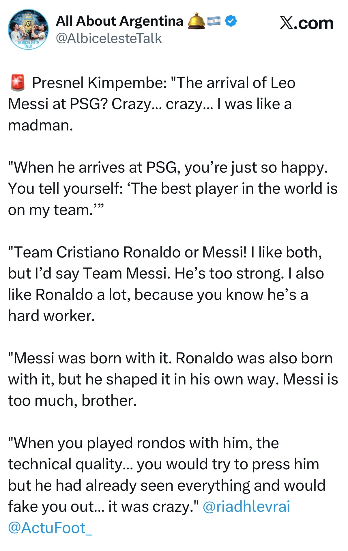 当他来到巴黎圣日耳曼时,你简直欣喜若狂。你会对自己说:‘世界上最好的球员在我的球队里。’”