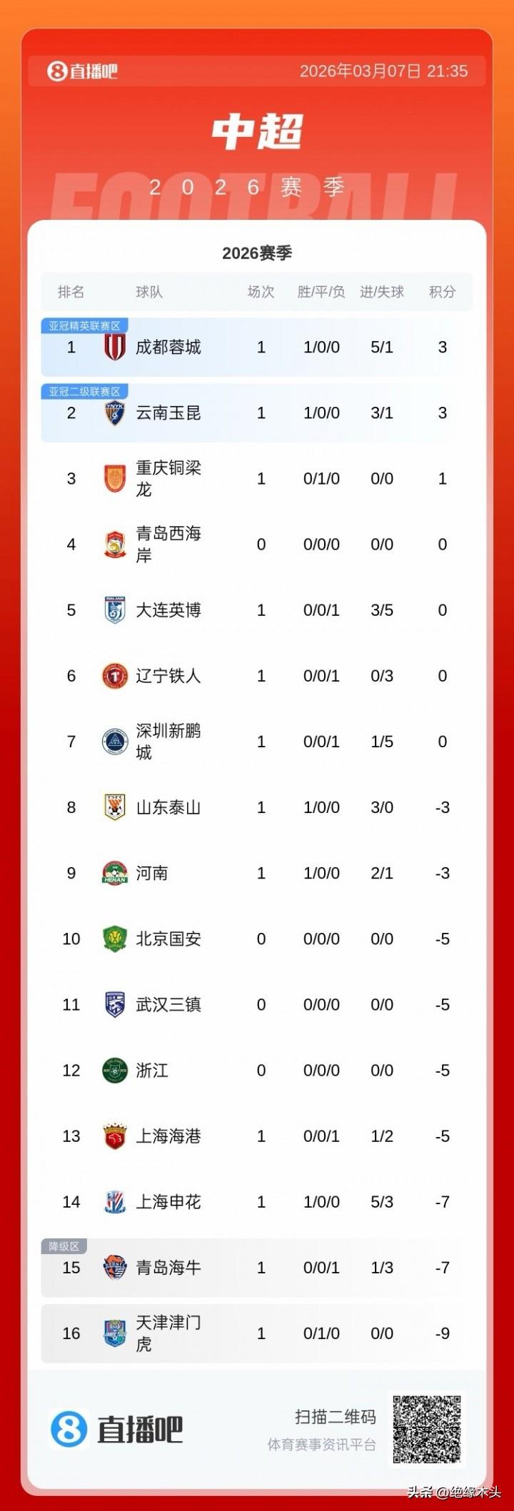 哈哈!重庆踢平,联赛第三!辽宁大败未掉出前六,泰山大胜,排名第8! 这积分榜在全球估计也是炸裂的存在! 3月7日举行了山东泰山VS辽宁铁人、天津津门虎VS重庆铜梁龙、上海申花VS大连英博、上海海港VS河南彩陶坊队、云南玉昆VS青岛海牛的5场比赛! 比赛结果:泰山3:0战胜铁人,津门虎0:0打平铜梁龙,申花5:3战胜英博,海港VS河南队、玉昆VS海牛! 这5场比赛说句老实话,都挺让人感慨的,不仅仅是即使3:0的泰山获胜也就排在联赛第8这样炸裂的积分榜,更多的是每场比赛都让人感觉意外! 泰山3:0战胜铁人,谁也没有想到铁人会如此头铁的攻出来,结果反倒是被经验老道的泰山抓机会反击。泰山更是直接让出球权,坚决用反击来寻找机会,结果前场稳定发挥,打进3个! 津门虎0:0打平铜梁龙,打的是啥啊,看的人直接瞌睡!唯一可说的是,这是天津津门虎连续第5个赛季首场就打平。更让人感觉心悸的是,天津津门虎开局打平的对手大多都降级了,所以铜梁龙你小心点! 申花5:3战胜英博,你说英博打的不好吗?他打进3个,你说他打的好吗?他丢了5个!同时很多人没有想到双方的外援这么猛,8个进球外援打进7个,申花的盖伊和拉唐都双响! 海港1:2负于河南队,只能说双方各打了半场球,上半场河南队简直杀疯了开场一闷棍打蒙海港,1分钟就进球,然后还有4个门柱都没进,新外援姆布拉真的就只值10万欧,各种机会却各种不进。下半场海港明显反应过来,围着河南队的大门猛攻,河南队只能找机会偷袭一下。主裁唐顺奇吹的太牛了,谁都不满意,除了一个河南队的进球,还吹出来了海港的两个进球,漏判了河南队的一个点球!全场MVP海港门框! 玉昆3:1战胜海牛,这场比赛玉昆的高原优势+开场三板斧抢开局还是强,上半场就3:0领先了。下半场年仅16岁的邝兆雷登场,开始还有点紧张,但其他几脚传球还不错,不过身体还显单薄,几次身体对抗都不成功,不过16岁上来感受感受中超气氛,还传出来一脚威胁球,也算不错!同时今年海牛的几个外援也就是叶博亚还算靠谱,其他的几个外援感觉不理想,起码这场比赛发挥的不咋地,今年有可能海牛冲甲了。 中超第一轮才进行了6场比赛,很明显的两个特点: 1 各个球队都在拼命,积分榜却又一片混乱,胜利了拿到3分却依然是负分,仅仅平局却又位列前茅,9队负分开局,这在世界足坛估计也是独一份! 2 各队年轻球员出场增多,年仅16岁的邝兆雷都出战了,很明显年轻人的机会正在增多! 3 6场比赛已经打进24球,各个球队都在努力进攻,几场进球多的比赛都有一个特性,后防的本土球员承压比较大,外援进攻依然犀利! 4 裁判依然是问题多多,多场比赛的裁判判罚让人不满,这种不满不仅仅是主场哨那样的偏袒一方,而是谁都不满,无论是主队客队,都很不满意。 中超第一轮还有两场比赛将在明天举行,浙江VS青岛西海岸,武汉三镇VS北京国安。