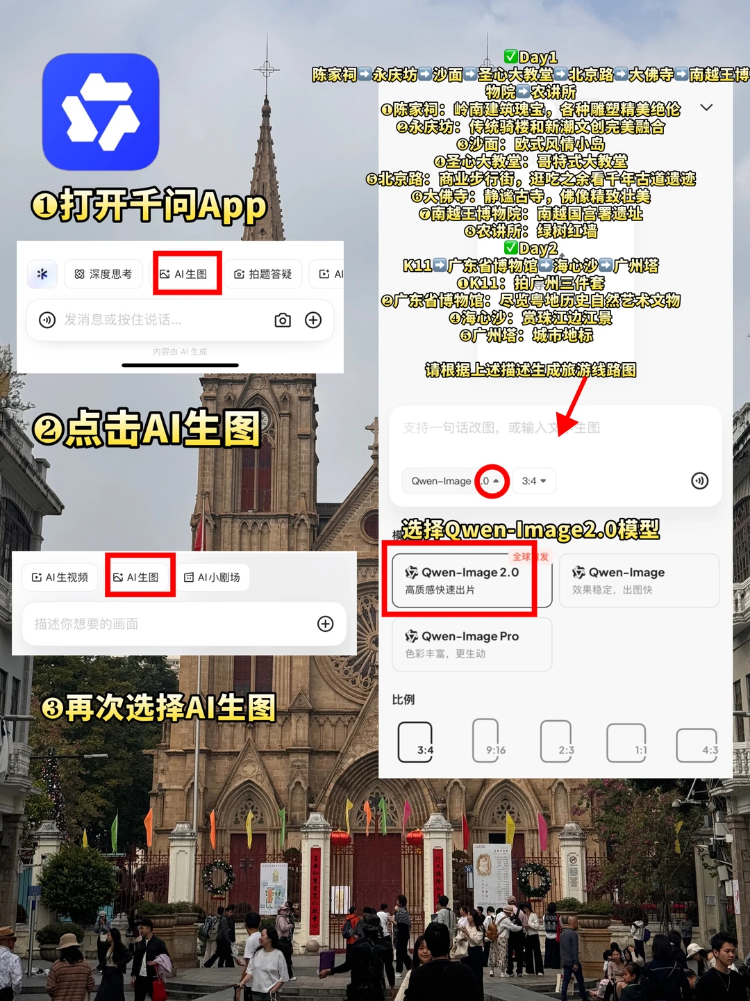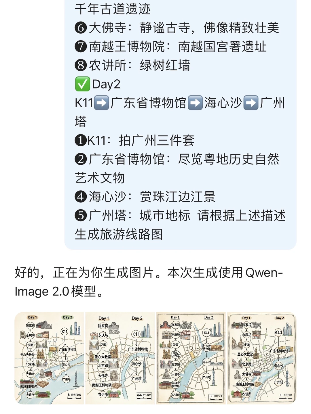 如果你有个周末,很推荐来广州逛逛,感受广州的魅力! - 🌈线路推荐:(图1) ✅Day1 陈家祠➡️永庆坊➡️沙面➡️圣心大教堂➡️北京路➡️大佛寺➡️南越王博物院➡️农讲所 ❶陈家祠:岭南建筑瑰宝,各种雕塑精美绝伦 ❷永庆坊:传统骑楼和新潮文创完美融合 ❸沙面:欧式风情小岛 ❹圣心大教堂:哥特式大教堂 ❺北京路:商业步行街,逛吃之余看千年古道遗迹 ❻大佛寺:静谧古寺,佛像精致壮美 ❼南越王博物院:南越国宫署遗址 ❽农讲所:绿树红墙 ✅Day2 K11➡️广东省博物馆➡️海心沙➡️广州塔 ❶K11:拍广州三件套 ❷广东省博物馆:尽览粤地历史自然艺术文物 ❹海心沙:赏珠江边江景 ❺广州塔:城市地标 -🥘美食(平价米其林) 向群、味食家、大鸽饭、文记壹心鸡、南园酒家、坚记、同记鸡粥粉面、容意发牛杂店、顺记冰室 - ⚠️旅行Tips ❶省博一定要提前预约,如果约不到可以尝试约特展,也可以🆓进省博参观!不同时间段有🆓讲解 ❷永庆坊月亮桥开灯时间19:00-21:30,广州塔开灯时间17:30-18:00 来广州旅行按照图1顺序游玩就可以了 🌈旅行线路图绘制方法(如图5-6) 每次都有粉丝问我你这个旅行线路怎么画的?自己也想学习!博主今天就教给你一个简单的方法,利用千问ai生图功能就可以实现! ❶打开千问 ❷选择AI生图 ❸选择Qwen-image2.0模型,把你的行程输入到对话框后,跟他说“请根据上述描述生成旅游线路图”几秒钟就可以完成! - 👍可以说千问AI真的很方便,每个人都可以轻松拿捏!千问此次升级了生图2.0大模型,只需输入一段简单描述,即可快速生成海报、信息图、漫画图、PPT配图等多种类型的图片!大家可以玩玩看,欢迎在评论区分享你的成果! - 🏨住宿 ✅永庆坊:老城区,好逛好吃 ✅珠江新城:可以欣赏珠江和广州塔夜景 -