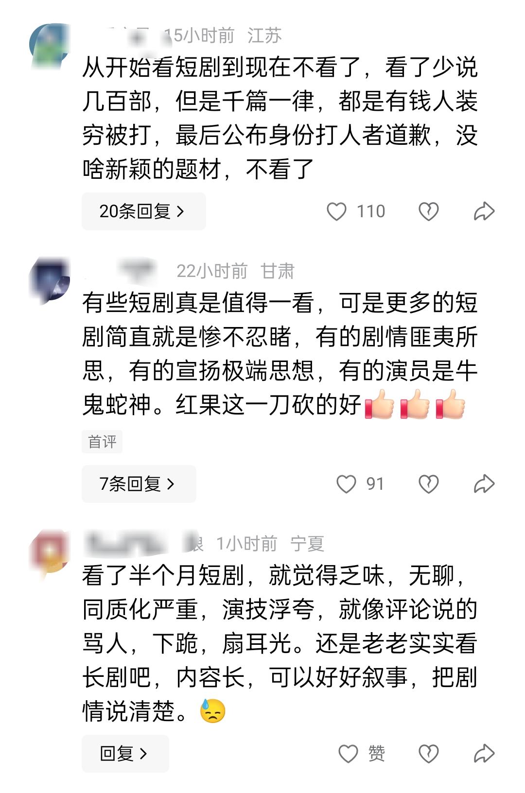 短剧行业彻底崩了!3000万保底说没就没,90%公司等死竟是自掘坟墓 刷到短剧行业的热搜,我直接惊得手里的奶茶都洒了!红果一刀砍了3000万保底,整个行业集体崩盘,90%公司要凉,这塌房速度比短剧里的霸总翻脸还快! 谁能想到,前两年还赚得盆满钵满的短剧行业,如今竟惨到连底裤都不剩。这哪里是遇寒冬,简直是直接被按进冰窖里冻僵! 别觉得这些公司惨是活该,以前这行简直是躺赚天堂!拍出来就有保底分账,哪怕拍得稀烂也稳赚,我表姐前年进短剧公司,月薪直接翻三倍,嘴角压都压不住! 那时候不管剧本多烂,演员演技多尬,只要拍出来就能拿钱,压根不用愁票房和播放量,多少人挤破头想往里钻。 可好日子才过两年,这行就自己作到天花板!成本直接失控到离谱,头部演员日薪飙到5万,一部剧凑五六个顶流。 三百万的投资,片酬直接吞掉一半,道具抠到用塑料瓶当花瓶,演员一天拍18小时,累到腰都直不起来,这剧能拍好才怪! 我刷到过一个短剧花絮,演员连妆都花了还得接着拍,群演的衣服都洗得发白,钱全让顶流赚走,制作方就剩抠搜。 更离谱的是,头部公司去年一年亏了7个亿,这钱拿打火机烧都没这么快,真的看傻我了! 本以为勒紧裤腰带能扛过去,结果AI短剧直接杀疯了,给了真人短剧致命一击! 《斩仙台》AI版6天播放破亿,成本才10万,真人拍得大几十万,AI成本才十分之一,我编剧朋友愁到头都要秃了,说现在写剧本都快没饭吃了。 更吓人的是,现在AI都能一人一天一部剧,场景特效比真人还精致,这谁顶得住啊,真人演员直接被卷到没活路! 中腰部演员更惨,片酬腰斩还接不到戏,以前挤破头的试镜,现在门可罗雀,好多人都转行去做直播了。 说到底,短剧行业凉透了,根本不是AI的错,是自己把路走死了!内容烂到骨子里,套路翻来覆去就那几个。 龙王归来、霸总砸杯子、假千金验DNA,好几部剧台词都一模一样,我刷到第三集就腻了,手指划得快出火星子! 观众早就看吐了这些烂梗,弹幕全是吐槽,可制作方还在硬着头皮拍,就为了吃保底,完全不管观众感受。 去年还吹短剧规模超院线,677亿干翻电影518亿,可电影发展几十年,短剧才两三年,把粗制滥造、顶流片酬的糟粕全学了,精品没几个,活脱脱一个食之无味的压缩饼干! 这波操作直接让中小公司死翘翘!杭州有家公司筹备的民国剧直接黄了,服装道具堆仓库,前期投入血本无归。 我邻居家弟弟在短剧公司做摄像,上个月直接被裁,底薪都没拿到,蹲家半个月连个面试都没有,看着都揪心。 就连影视城都遭殃,湖州那个拍民国剧的基地,订单骤降,只能靠做AI协作勉强撑着,太惨了! 有人骂红果心黑,可我觉得这波是刮骨疗毒!以前靠保底躺赚,谁还用心做内容?取消保底才让大家知道,影视行业从来都是内容为王。 我闺蜜开甜品店,踏踏实实做口味,不搞花里胡哨的,生意越做越好,反观短剧行业,满脑子都是赚快钱,不凉才怪! 现在也有少数短剧团队在转型,做现实题材,打磨剧本,播放量反而一路涨,这说明观众不是不爱看短剧,是不爱看烂短剧! AI从来都不是原罪,懒于创新、只想躺赚才是!那些还在靠烂梗圈钱的团队,迟早被市场淘汰。 你们还在追短剧吗?觉得AI短剧会彻底取代真人短剧吗?那些烂大街的短剧套路,你最烦哪一个?评论区唠唠 短剧 红果短剧平台 微短剧行业报告 红果短剧收益