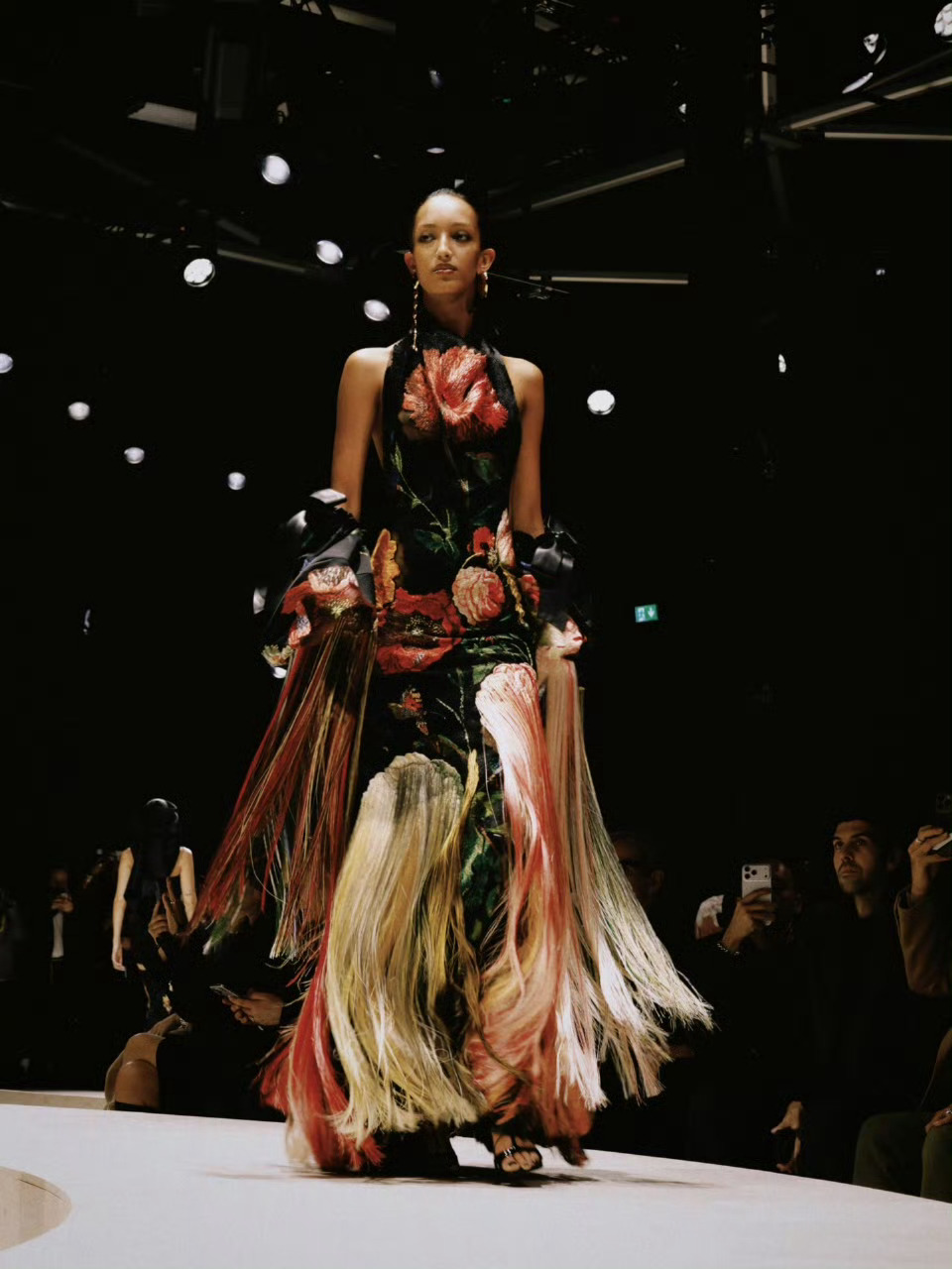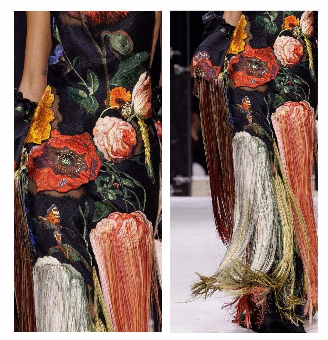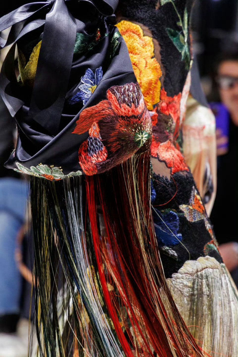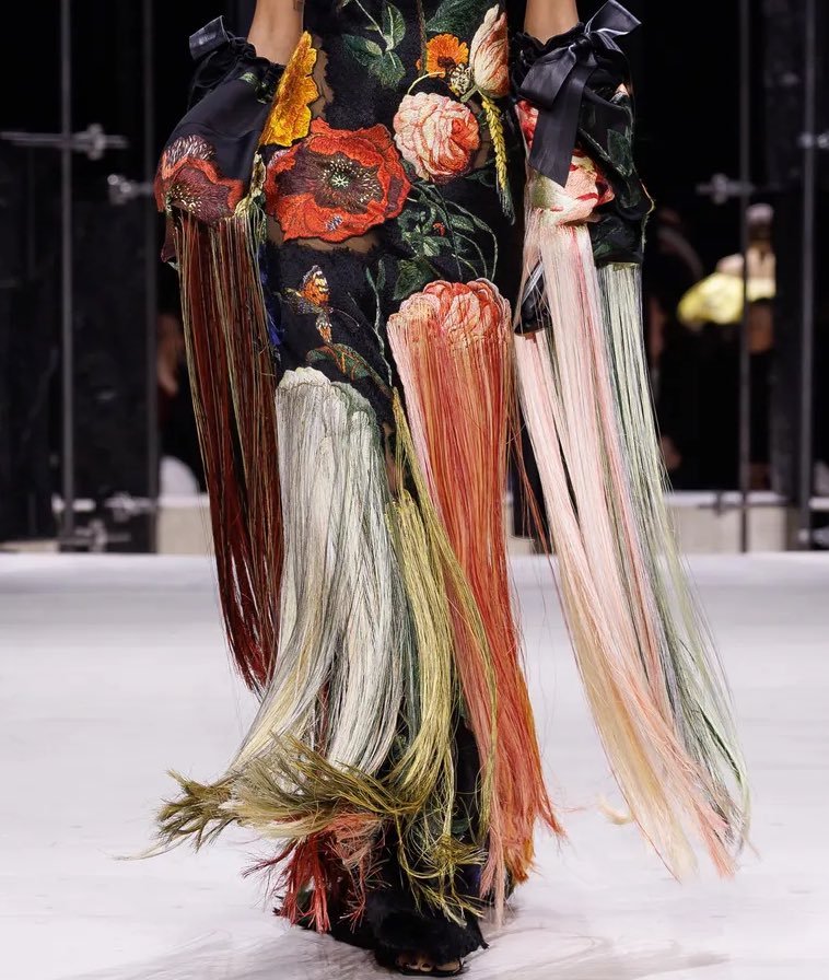 2026秋冬系列最精彩的一条礼裙,灵感设计来源擅长古典静物创作的菲律宾当代艺术家Olan Ventura。刺绣工艺打造的绚烂多彩花卉图案与流苏如同艺术作品绘于缎面黑礼裙上,精湛剪裁与露背设计完美贴合女性身材曲线,而流苏则随着步伐飘逸,非常的美!期待红毯上的演绎~