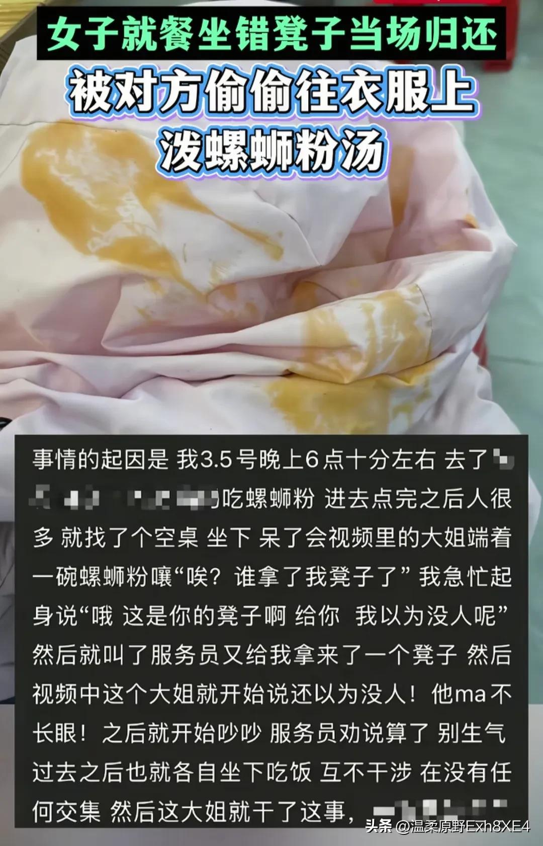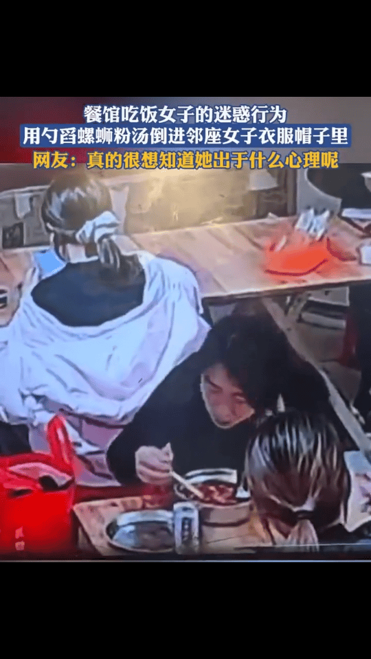 “人在做天在看!”河北保定,一女孩去吃螺狮粉,进到店里人很多,点完餐,就找了张空桌先坐下!谁知一个大姐端了碗螺蛳粉,走到女孩这就开始嚷嚷:“哎?谁拿了我凳子了” 女孩看看周围,立马明白过来,急忙起身客客气气说:“哦,这是你的凳子啊。给你,我以为没人呢” 可大姐得理不饶人,开始吵吵,直到服务员过来劝说,大姐这才坐下吃饭。 女孩也以为没事了,开始安心吃螺狮粉。但没想到的是,吃完后发现,羽绒服帽子上油乎乎的,闻着一股螺蛳粉味! 调监控查看,原来是刚才那大姐趁她吃饭时,偷偷在背后一勺一勺把汤泼进了自己帽子里。 网友热议: “坐她对面的女士是朋友吗?这下应该看清她的真面目了吧!” “损到骨子里了,几岁小孩都干不下来这个事,这种人必须严惩[打脸]” “最讨厌这种人,面对面屁都不敢放,暗地里使坏,伺机报复,就是心理阴暗[石化]” 这件事中,像这样拿错凳子的情况,相信大家都有经历过,很平常。正常人要么从旁边抽一张,要么叫服务员再拿一张就是。 可这位大姐的心眼小得让人叹为观止!真是很难想象,她的朋友、男人在她身边是咋活过来的[捂脸]? 您见过如此小心眼、还蔫坏的人吗?