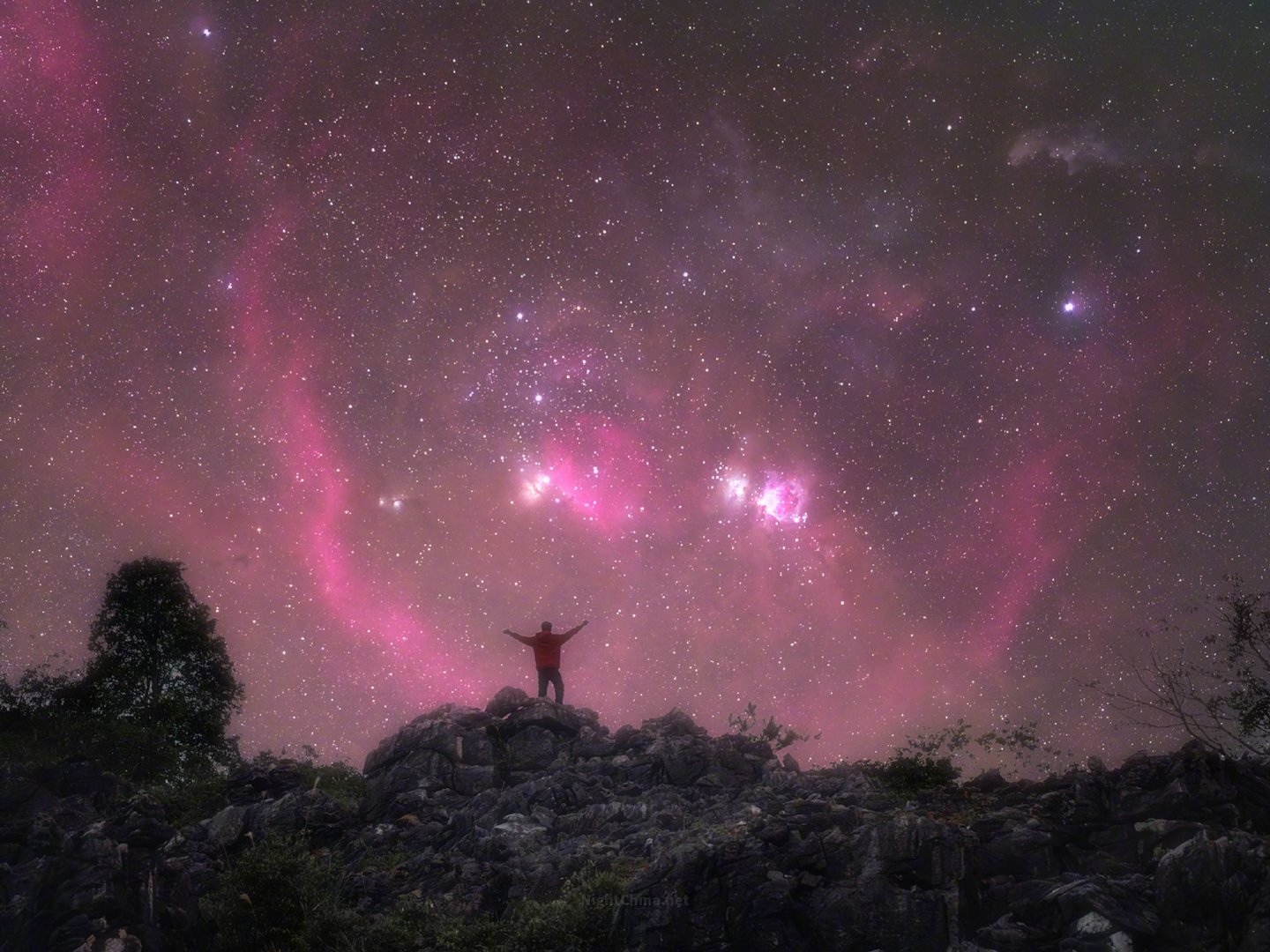 猎户座大星云与周围的发射星云弥漫成片,而巴纳德环在更外围画出一道舒缓的弧线,那是数百万年前一颗超新星爆发后遗留的气体壳层,至今仍在缓缓膨胀。群岩之巅,有人张开双臂站在这一切之下。脚下是沉默的石头,头顶是仍在演化的宇宙,人恰好站在两者之间。