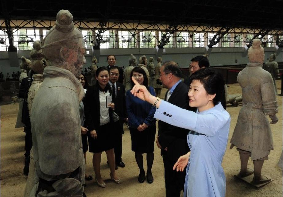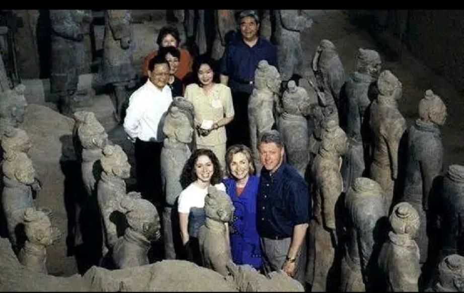 克林顿夫妇等人分别参观兵马俑的情形。 英女王帽子的造型挺别致,恍惚间有种穿越的感觉; 看得出来,默克尔也觉得这匹马好逼真; 站在克林顿夫妇中间的切尔西好幸福,一家人同游很温馨; 跟在马克龙身后的布丽吉特穿着红衣服,兴高采烈的她娇艳如花; 无意中莫迪被代入进去,恰好合成一幅搞笑的画。 翘着兰花指的朴槿惠,添了几分古典风韵。