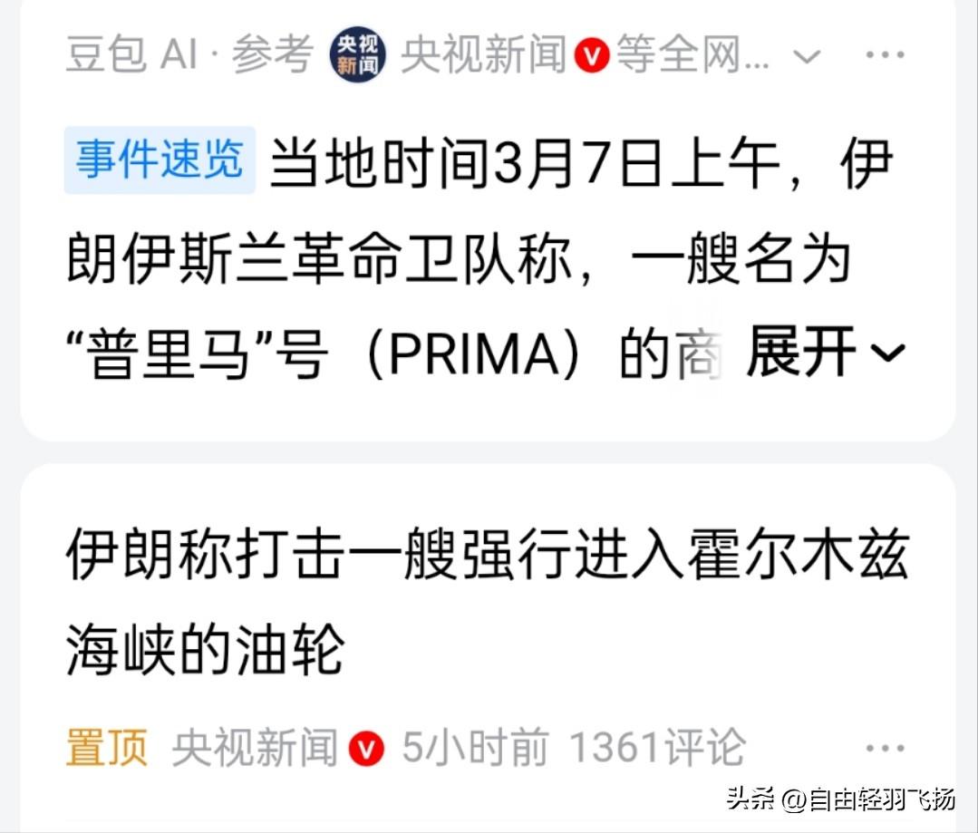 伊朗革命卫队称打击了一艘无视警告的油轮! 当地时间3月7日上午,伊朗伊斯兰革命卫队宣称,一艘名为“普里马”号的商用油轮,因无视革命卫队海军的多次警告,强行闯入霍尔木兹海峡,最终被一架无人机击中,瞬间陷入火海。 霍尔木兹海峡,这条连接波斯湾和公海的狭窄水道,虽貌不惊人,却掌控着全球能源的命脉。全球约三分之一的海运石油都要从此经过,日均石油通过量高达2000万桶,相当于全球石油消费量的五分之一,其重要性不言而喻。 也正因如此,它成为了美伊冲突中的关键“战场”,一举一动都牵动着世界经济和政治的神经。伊朗官方虽称未封锁霍尔木兹海峡,但早已划出“红线”。 伊朗革命卫队多次强调,美国、以色列以及欧洲等支持美以的国家的商船和油轮,禁止在此通行。然而,普里马”号油轮却似乎低估了伊朗的决心,执意闯入,最终招致打击。 其实,这并非霍尔木兹海峡近期发生的首次油轮遇袭事件。就在一天前,即当地时间3月6日,这里就上演了一场悲剧。国际海事组织秘书长多明戈斯痛心疾首地表示,当天有4名海员丧生,还有3人重伤。 更令人揪心的是,在此之前,已有2名海员在此因袭击身亡,还有1人失踪。这些数字的背后,是一个个鲜活生命的消逝,是无数家庭的破碎,战争的残酷在此展现得淋漓尽致。 如今,还有约2万名海员被困在海湾地区,他们仿佛置身于“人间炼狱”,安全风险如影随形,精神压力也达到了极限。他们每天都在担惊受怕中度过,不知道下一秒危险是否会降临,不知道自己能否平安回家。 从国际海事组织发布的消息来看,自美国与以色列入侵伊朗的战争爆发以来,短短一周时间,霍尔木兹海峡就已成为了海员的“噩梦之地”。6名海员遇袭身亡,1人失踪,2人重伤,2万多名海员被困,这样的数字让人触目惊心。 回顾近期局势,美伊冲突可谓是愈演愈烈。2月28日,美以对伊朗发动了大规模空袭,瞬间打破了中东地区的宁静。伊朗自然不会坐以待毙,迅速展开了一系列报复行动。 导弹、无人机纷纷登场,目标直指美以在中东的军事基地和相关目标。而霍尔木兹海峡,作为伊朗手中的一张“王牌”,也成为了其反击的重要战场。 3月5日凌晨,波斯湾北部就曾传来一声巨响,一艘美国油轮被伊朗革命卫队用导弹击中,燃起熊熊大火。伊朗更是直言,战争时期霍尔木兹海峡的通行规则由其掌控,任何违反规则的船只,都将受到严惩。 伊朗为何有底气在霍尔木兹海峡“亮剑”?一方面,霍尔木兹海峡最窄处仅33公里,伊朗在沿岸部署了大量反舰导弹、无人机和巡逻艇,形成了强大的防御体系,具备强大的非对称作战能力,即使是强大的美国航母战斗群,也不敢轻易在此造次。 另一方面,美以的空袭已让伊朗退无可退,捍卫国家主权和尊严,成为了伊朗别无选择的使命,伊朗唯有以强硬姿态反击,才能让对手看到自己的决心,才能在这场残酷的博弈中占据一席之地。 那么,伊朗的这些行动,对全球而言意味着什么呢?首先,全球能源市场遭受了巨大冲击。3月6日,国际油价便已暴涨,美油主力合约收涨12.67%,报91.27美元/桶,布油收涨9.26%,报93.32美元/桶。 这仅仅是开始,如果冲突持续,油价可能还会继续攀升,甚至冲击100美元/桶大关。石油作为工业的“血液”,其价格的波动,将直接影响到化工、塑料等多个行业,进而可能推动全球通胀水平上升,给全球经济复苏带来沉重打击。 其次,国际航运市场也陷入了混乱之中。丹麦航运公司马士基与德国海运公司赫伯罗特,已相继宣布暂停多条中东主要航线服务。多家集装箱航运公司也纷纷效仿,全面暂停在霍尔木兹海峡及其周边地区的航运服务。 这不仅让航运公司的营收大幅减少,还导致运费和保险费飙升,这些额外的成本最终都会转嫁到消费者身上,普通民众的生活将受到直接影响。曾经繁忙的霍尔木兹海峡,如今船只寥寥,往昔的繁荣景象已不复存在,取而代之的是一片紧张与萧条。 面对如此紧张的局势,国际社会纷纷发出呼吁,希望各方保持克制,尽快缓和局势。联合国秘书长谴责冲突升级,呼吁各方尊重国际法,停止敌对行动。 如今,霍尔木兹海峡的局势依旧紧张,“普里马”号油轮的大火或许还未熄灭,它仿佛是一个“信号灯”,警示着世界战争的危险与残酷。伊朗官方在油轮遇袭后还发布声明:“我们等待美军抵达霍尔木兹 - 阿拉伯海峡。” 战争,从来都没有真正的赢家。无论是美国、以色列,还是伊朗,都会在战争中遭受损失,而无辜的民众更是会陷入水深火热之中。霍尔木兹海峡的油轮遇袭事件,只是美伊冲突的一个缩影,它反映出的是地区霸权与主权捍卫之间的激烈碰撞。 和平才是发展的基石,只有远离战争,世界才能走向美好的未来,霍尔木兹海峡才能重新恢复往日的平静与繁荣。