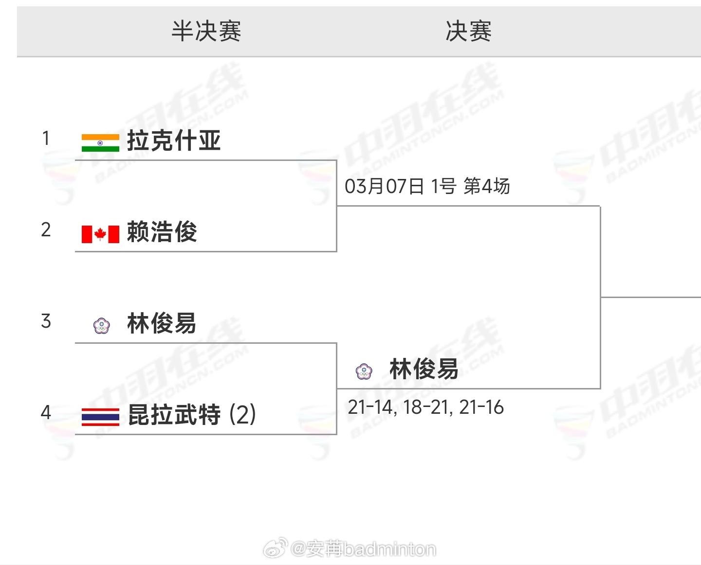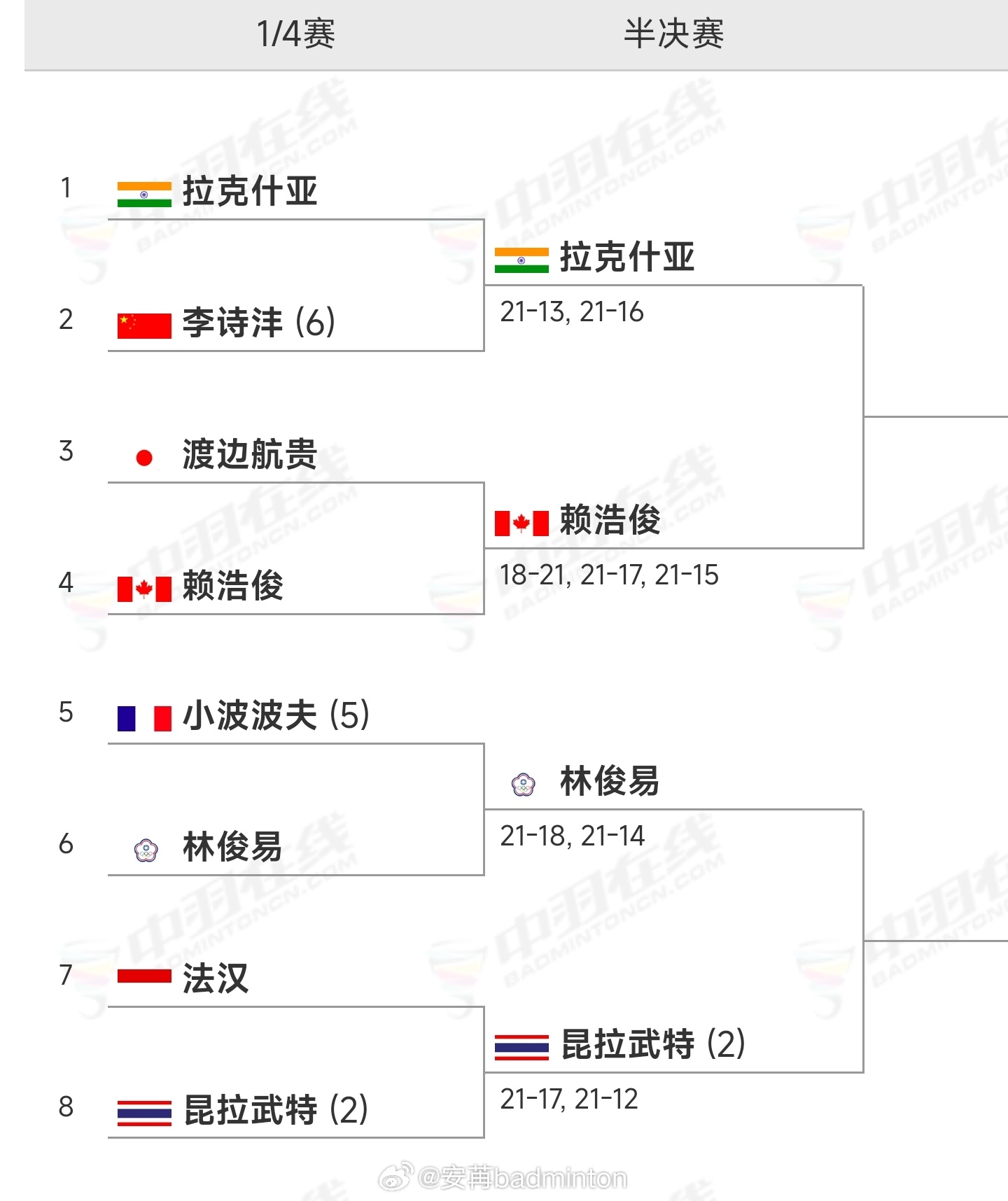 拉克什亚🇮🇳 21-16 赖浩俊🇨🇦男单半决赛