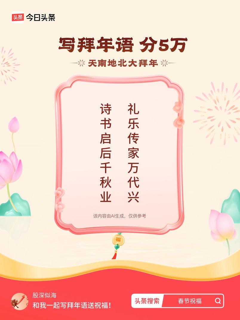 写拜年语送祝福新春拜年送祝福!我的祝福是:“诗书启后千秋业,礼乐传家万代兴”!快来一起写祝福吧戳这里,一起领红包>