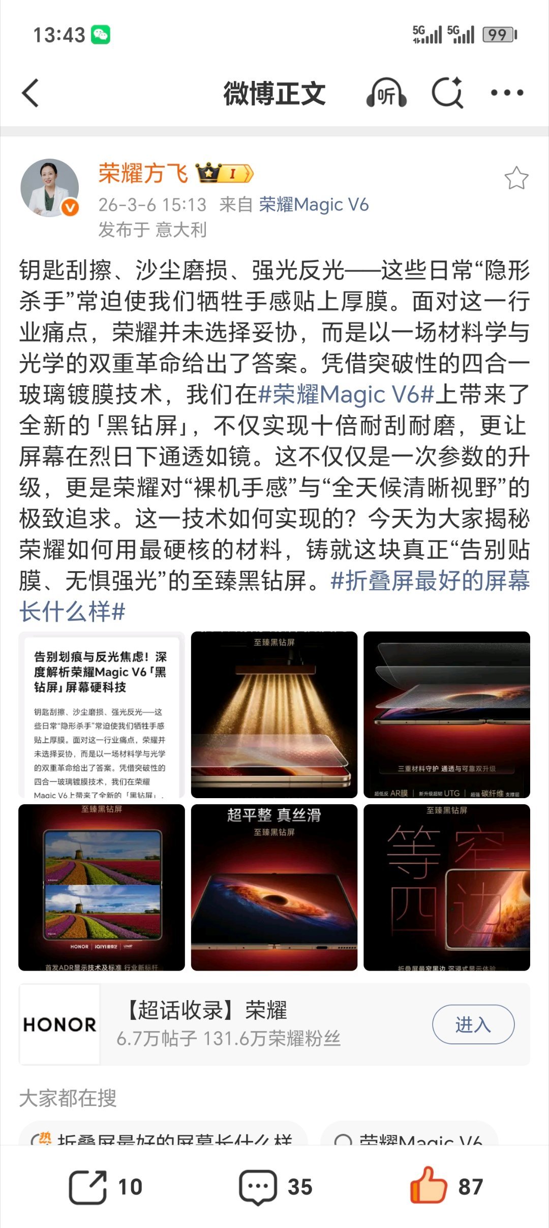 十倍耐刮耐磨!荣耀Magic V6首发黑钻屏:告别贴膜与反光焦虑