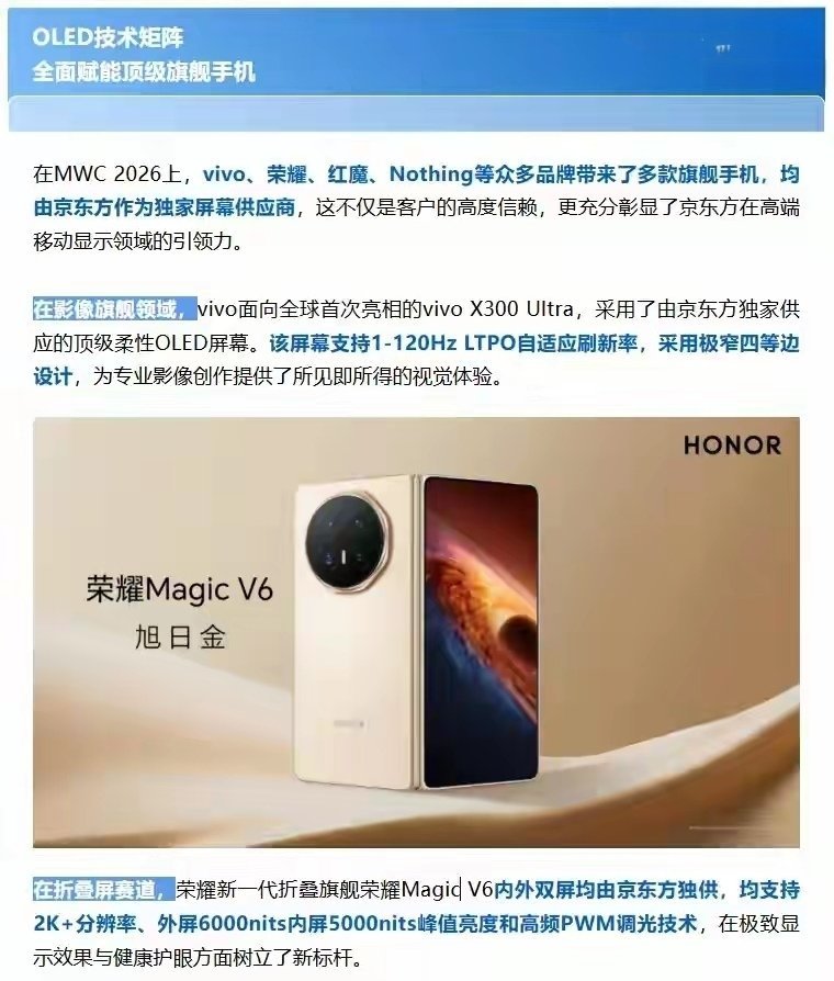 【vivo X300 Ultra、荣耀Magic V6确认搭载京东方OLED屏幕】