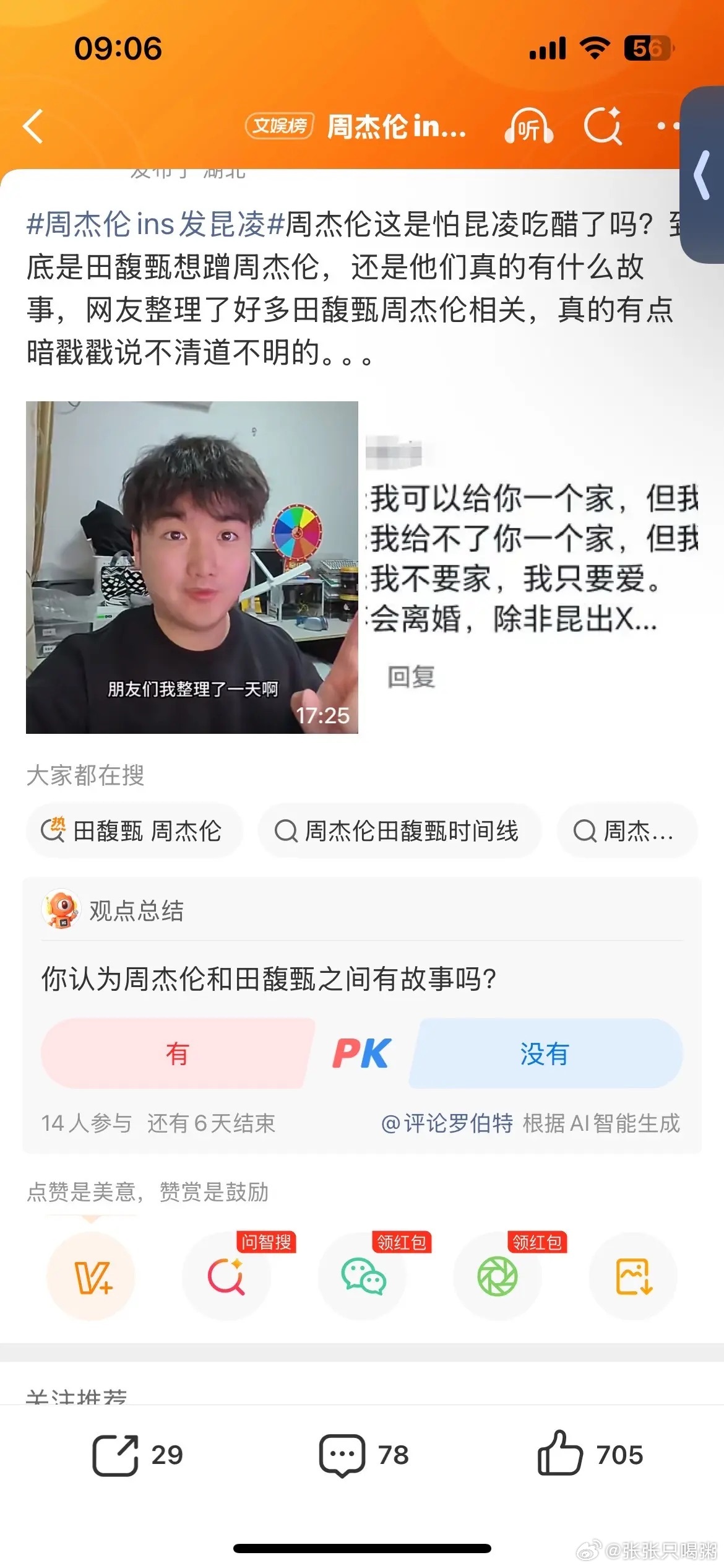 周杰伦ins评论区周杰伦发布妻子昆凌日常视频,引发与田馥甄的CP粉集体情绪崩溃,相关话题单日阅读量破10亿事件核心脉络1。导火索:周杰伦家庭动态触发CP粉破防2026年3月6日,周杰伦在Instagram发布与妻子昆凌的日常互动视频,展现夫妻恩爱状态。部分CP粉因期待周杰伦与田馥甄(Hebe)"复合",对此动态强烈不满,涌入周杰伦账号评论区辱骂,如"算什么男人""精神出轨"等极端言论。昆凌账号亦遭"让位""离婚"等骚扰留言。2。破防根源:网络考古引发的"复合幻想"事件发酵前,B站博主整合周杰伦与田馥甄早年互动细节(如歌词藏头,330数字巧合等),播放量超百万。CP粉将田馥甄3月5日"大酥特酥"文案与周杰伦"大吃特吃"动态关联,解读为"隔空互动"。周杰伦晒红酒时裁掉昆凌出生年份(1993年),保留田馥甄出生年份(1983年)的操作被强化为"暗号".3。舆论两极分化CP粉立场:坚称两人存在"未完结的遗憾",破防后宣布转为田馥甄唯粉,助推其歌曲登顶QQ音乐飙升榜。公众批判:多数网友认为CP粉越界骚扰艺人家庭,强调"周杰伦已婚11年育有三子,田馥甄专注音乐",呼吁尊重现实。