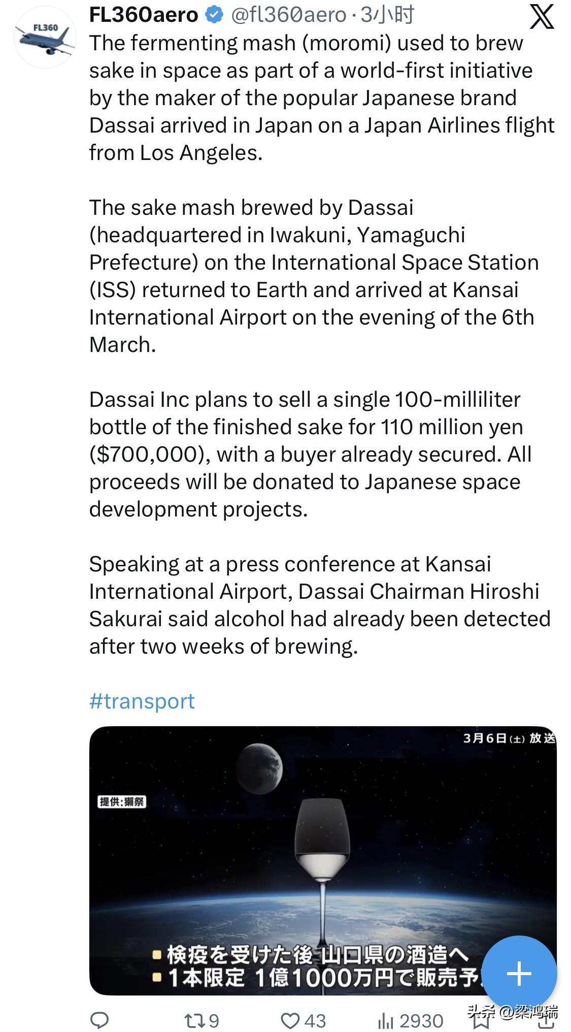 著名日本清酒品牌“獺祭”在太空酿造的酒醪,已安全返回地球。这标志着人类历史上首次在太空环境中进行清酒发酵实验,也是日本传统酒文化迈向宇宙时代具有象征意义的一大步。3月6日晚,从美国洛杉矶出发的日本航空航班运载的容器抵达关西国际机场。容器内以冻结状态严格保护,装载着在国际空间站诞生的珍贵酒醪。 实现这一创举的是总部位于山口县岩国市的株式会社獺祭主导的“獺祭MOON项目”。该项目的最终目标是到2050年左右,在月球表面实现獺祭的正式酿造。通过提升月球居民的生活质量,并为他们提供“润泽”的精神慰藉。作为项目第一阶段,2025年10月21日,从日本种子岛宇宙中心使用H3火箭7号机发射了专用小型酿造装置及原料(山田锦米、麹、酵母、水),经新型补给船HTV-X运抵国际空间站。随后,在国际空间站的日本实验舱“希望”内,日本宇航员油井龟美也负责安装装置、注入水并启动发酵。在模拟月球重力(地球约1/6)的特殊环境下,装置通过自动搅拌,进行了约两周的平行复式发酵。 太空中的发酵速度比地面稍慢,但酒精成分仍顺利生成。原本准备了两台装置,但其中一台出现故障,因此仅一台成功。获得的酒醪约为260克,发酵结束后在轨道上冻结保存。2026年2月27日,该装置在美国西海岸外海面溅落回收,以-50℃低温维持状态用强化纸箱包装,通过空运运回日本。预计3月13日运抵獺祭,进行详细分析后压榨,完成约100ml的清酒。这一人类首创的“太空酿造清酒”命名为“獺祭MOON——宇宙醸造”,限量仅100ml一瓶,售价1亿1000万円(约545万元人民币)。虽然价格天价,但买家已确定,全部收入将捐赠给日本的宇宙开发事业。至于口感,目前仍属于“未知”,但其价值远超金钱,蕴含着无可比拟的历史意义。在太空长期滞留的时代即将来临之际,酒不再仅仅是嗜好品,而是维系精神丰盈与故乡记忆的重要存在。獺祭的这一挑战,是将日本酒传统带到宇宙尽头,增加人类“干杯”时刻的勇敢尝试。地球外首次发酵的这一滴酒,将展现出怎样的香气与风味?分析结果与最终完成的酒,正吸引着全世界的目光。