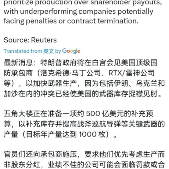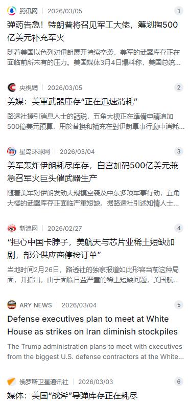 急了!美国政府下死命令,要求美国军工企业连轴转,加班加点生产导弹!3月4日,根据外媒报道,外媒称,特朗普政府将会见美国顶级国防承包商。包括洛克希德·马丁公司、雷神公司等。白宫的一位发言人表示,他希望加快武器生产,因为美国的武器库存因伊朗、乌克兰和加沙等冲突而紧张。   麻烦看官老爷们右上角点击一下“关注”,既方便您进行讨论和分享,又能给您带来不一样的参与感,感谢您的支持!   这事儿说起来真有点黑色幽默。就在前几天,特朗普还在社交媒体上拍着胸脯说,美国的弹药“几乎无限”,仗想打多久就能打多久。可话音刚落,到了3月4号,外媒就集体爆料,白宫急得像热锅上的蚂蚁,马上要把洛克希德·马丁和雷神这帮大军火商的老大们叫到白宫开会。这不是喝茶聊天,这是下死命令:别管什么股价分红了,得连轴转、加班加点给我造导弹!这一巴掌,算是把美国那点家底给扇了个底朝天 。   为啥这么急?因为五角大楼那边真的顶不住了。那边刚砸出去一份近五百亿美元的紧急预算申请,这笔钱不是用来研究什么高科技新武器的,用途特别单一,就是赶紧买货填坑。坑有多大?在伊朗方向、乌克兰战场、还有加沙地带,这是实打实的“三线消耗”。特别是最近对伊朗的大规模空袭,打出去的可都是贵得离谱的玩意儿,像战斧巡航导弹这种压箱底的家当,几百枚几百枚地往外扔,库存水位线眼看着就跌破了安全红线 。   这就引出了一个特别拧巴的现实。白宫那边虽然嘴上不承认,但行动很诚实,直接对军火商摊牌了:别老想着拿赚的钱去回购股票、给股东发大红包了,先把活儿干完。按说军火商应该高兴,大订单来了。但问题是,这活儿不是你想赶就能赶出来的。战斧导弹现在的年产量连一百枚都不到,雷神虽然跟五角大楼签了新协议,目标是以后每年搞到一千枚,但那也是以后的事。现在生产线就算冒烟,也变不出导弹来,这种工业上的“拖延症”,真到了打仗的时候就成了催命符 。   美军现在在中东的处境,其实挺尴尬的。虽然仗打得顺风顺水,但那都是用钱堆出来的。伊朗那边发射廉价的自杀式无人机,美军这边就得用几百万美元一枚的标准-3拦截弹去接。这种仗打久了,账谁都算得过来。现在最头疼的不光是钱,而是有些东西你有钱也买不来,比如那些躺在仓库里等着应对亚太方向的“家底”,都快被中东这个无底洞给吸干了 。   更让五角大楼睡不着觉的,还有一个藏在背后的“七寸”。造这些高精尖的导弹,离不开稀土和高端芯片。说来可笑,美国现在有点“手停口停”的意思,因为造导弹必需的钇和钪这些稀有金属,几乎全指着从中国进口。去年中美那场贸易摩擦,中国这边一卡脖子,美国的稀土价格立马坐火箭,涨了六十多倍。有些供应商甚至都不敢接单了,因为原材料搞不到。你这边开会催着工人加班,那边发现炉子里没米下锅,这才是最深层的焦虑 。   所以现在白宫这出“召见军火商”的戏码,与其说是强硬的增产令,不如说是一场被逼到墙角的“战略自救”。表面看是要填满弹药库,实际上是被全球这几场冲突撕开了工业基础脆弱的口子。特朗普之前说要搞什么“金库计划”,囤积关键矿产,但那玩意儿远水解不了近渴。眼下最现实的问题是,如果哪天连战斧导弹都得省着用,甚至得琢磨优先打哪个目标的时候,美国这全球霸权的架子,还端得稳吗?这种焦虑,才是这五百亿预算和这场紧急会议背后,真正想说又说不出口的尴尬 。