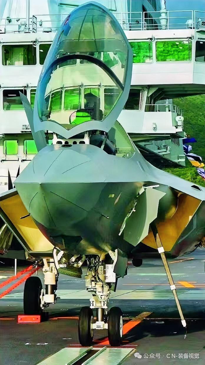 正面欣赏系留在福建舰航母甲板上的J-35战机放下自带的折叠登机梯,鹰气十足!