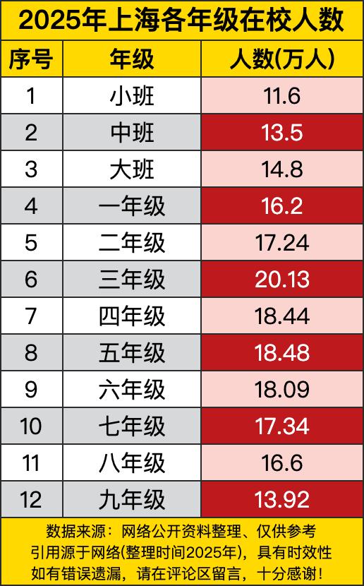 从幼儿园小班到初三,在校生数量呈现出有趣的波浪形变化。小学三年级是人数最多的年级,达到20.13万人,而幼儿园小班只有11.6万人,这两个数字的差距将近一倍。从三年级的峰值开始,各年级人数逐步下降,到初三只剩13.92万人,少了将近三分之一。 仔细分析这些数字背后的原因,能发现人口变迁的轨迹。现在的小学高年级学生,大多是2015年前后出生的孩子,那几年正好是二胎政策放开后的生育小高峰。而幼儿园小班的孩子出生在2022年左右,这几年出生率持续走低,人数自然就少了。从小学到初中,人数逐渐减少,一方面反映了当年出生人口的自然下降,另一方面也与部分学生选择出国或者回原籍就读有关。 这份数据就像一个时间轴,记录着上海人口结构的变化。小班11.6万、中班13.5万、大班14.8万,幼儿园阶段的递增其实很有意思——不是因为每个班越读人越多,而是反映出近几年入园人数逐年递减的趋势。一年级16.2万、二年级17.24万、三年级20.13万,这个增长曲线清晰地勾勒出2016年前后生育高峰的印记。 这些数字背后,牵动着无数家庭的关切。孩子多的年级,意味着未来的中考、高考竞争会更加激烈;孩子少的年级,则可能面临教育资源相对充裕的局面。对教育部门来说,这些数据是规划学校布局、调配师资力量的重要依据;对家长而言,则关系到孩子的升学压力和机会。不知道各位读者家里有正在读书的孩子吗?你感受到哪个年级的竞争压力最大?欢迎在评论区分享你的观察和体会!