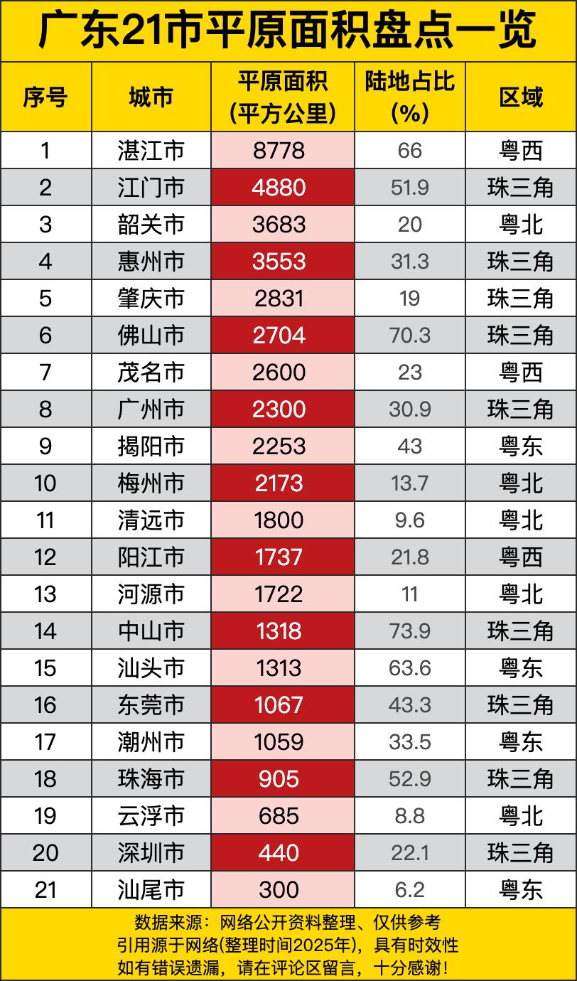 湛江以8778平方公里的平原面积高居榜首,占全市面积的66%,堪称广东的"平原之王"。江门4880平方公里排第二,平原占比51.9%。韶关、惠州、肇庆分别以3683、3553、2831平方公里位列第三至第五。让人意外的是,经济发达的深圳平原面积只有440平方公里,占比22.1%,汕尾更是仅有300平方公里平原,占比6.2%,成为全省平原最少的城市。 仔细分析这份榜单,能发现广东地理格局的鲜明特点。珠三角核心城市中,佛山平原占比高达70.3%,中山73.9%,珠海52.9%,东莞43.3%,这些城市的平原比例相当可观,为工业化和城市化提供了良好的自然条件。而广州虽然平原面积有2300平方公里,但占比只有30.9%,说明还有大量丘陵山地。深圳作为一线城市,平原面积只有440平方公里,比中山、珠海都小得多,这也解释了为什么深圳的城市建设要不断填海造地、向天空要空间。 从区域分布来看,粤西地区平原资源最为丰富。湛江8778平方公里、茂名2600平方公里、阳江1737平方公里,三市合计超过1.3万平方公里,是广东重要的农业产区和产业发展后备空间。粤东地区平原相对较少,揭阳2253平方公里、汕头1313平方公里、潮州1059平方公里、汕尾300平方公里,四市合计不足5000平方公里,人口密集与土地稀缺的矛盾比较突出。粤北山区更是以山地为主,韶关、梅州、清远、河源、云浮五市的平原占比普遍在10%左右,云浮更是只有8.8%。 这份平原面积榜单,实际上是一部广东发展的自然地理说明书。平原多的城市,发展空间相对充裕,农业、工业布局更为便利;平原少的城市,则要在有限土地上精打细算,走集约化发展道路。深圳的经验表明,平原面积小并不妨碍成为经济强市,关键是如何高效利用每一寸土地。湛江虽然平原广阔,但要转化为发展优势,还需要产业支撑和基础设施配套。不知道各位读者所在的城市平原多吗?你觉得土地资源对城市发展影响大不大?欢迎在评论区分享你的观察!