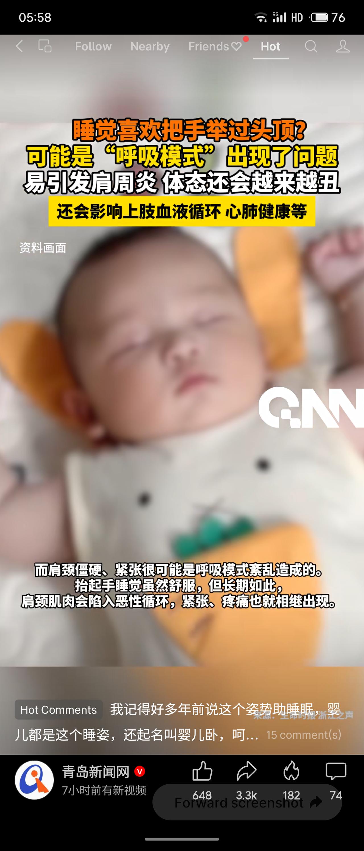 青岛新闻网指出,睡觉把手举过头顶的“投降式”睡姿,可能是呼吸模式紊乱导致肩颈紧张所致。长期如此会影响血液循环、诱发肩周炎,甚至影响心肺健康,引发网友热议。
