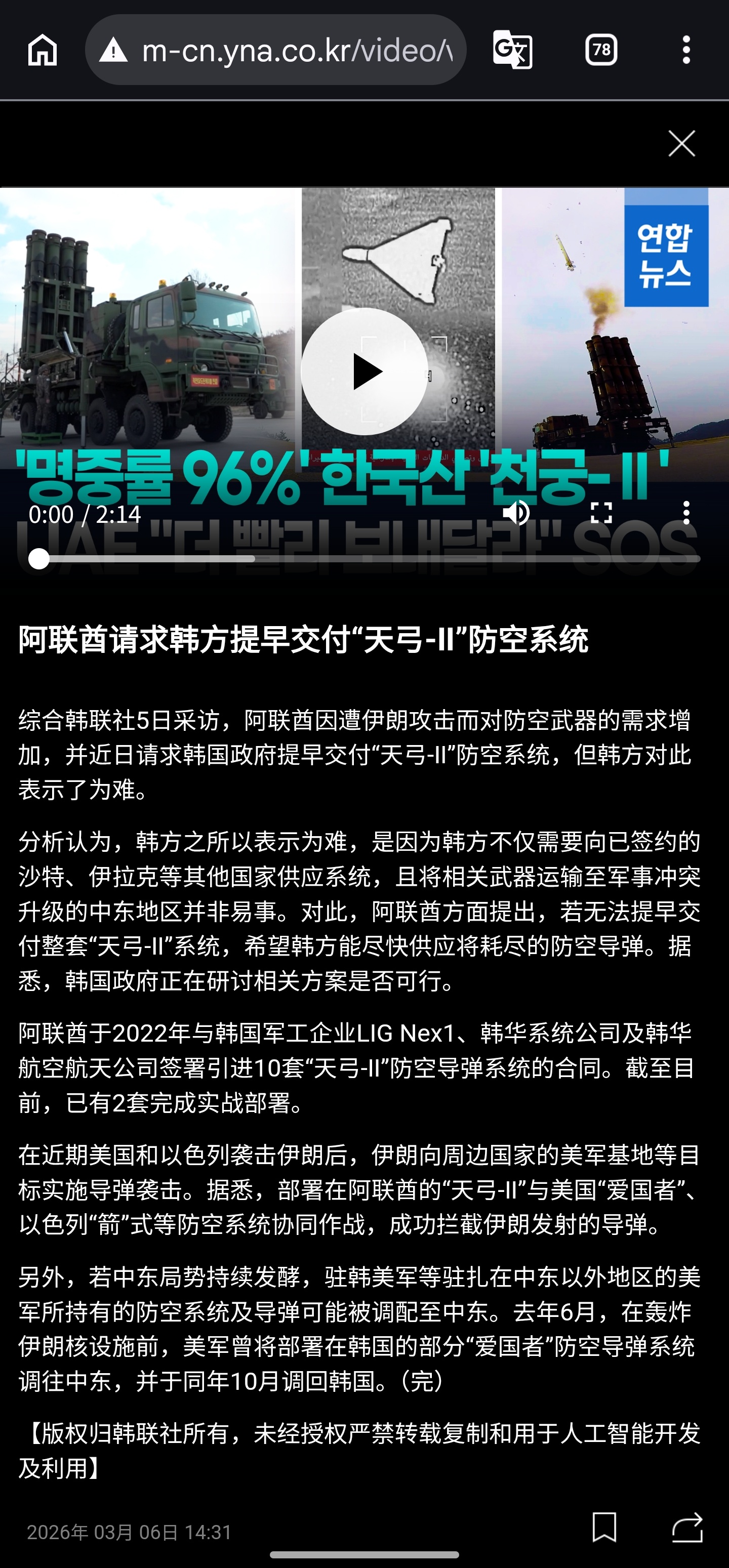 韩国国会议员、军事分析师柳永元称:“出口阿联酋的天弓-II 在拦截伊朗大规模导弹与无人机袭击中,发射 60 余枚,名中率高达 96%,”目前韩国只向阿联酋交付了两套天弓-II,共64枚待发弹,这意味着阿联酋可能将全部待发弹都发射了出去。