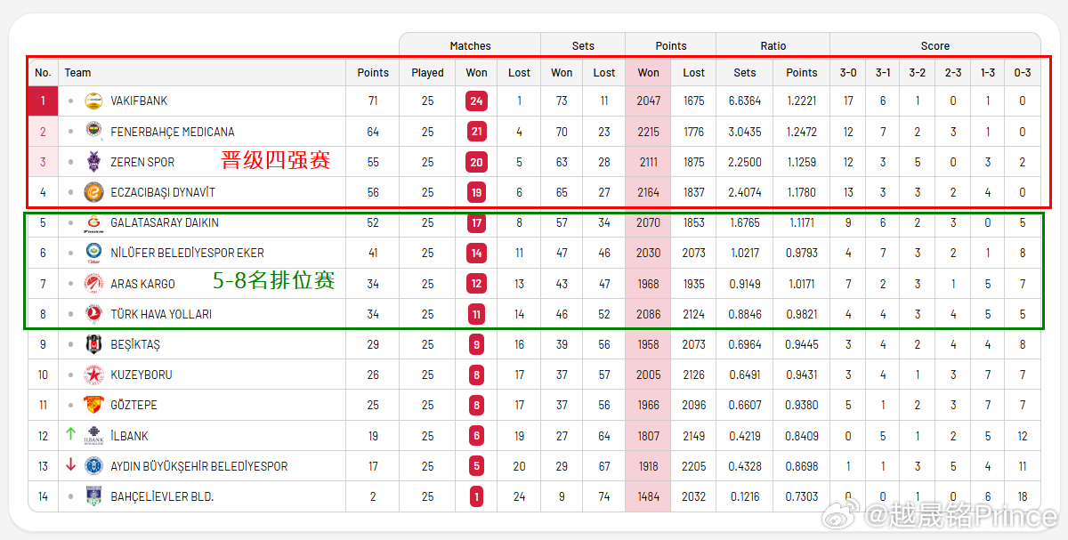 ⚔️ 随着伊萨奇巴希客场3-2战胜加拉塔萨雷,土超女排联赛4强已产生:瓦基弗银行、费内巴切、泽仁体育和伊萨奇巴希。泽仁体育和伊萨奇巴希,在最后一轮将分别对阵伊尔银行和艾登都会——排名倒三、倒二的队伍,取胜应不成问题。因此,土超半决赛对阵基本已确定👇: