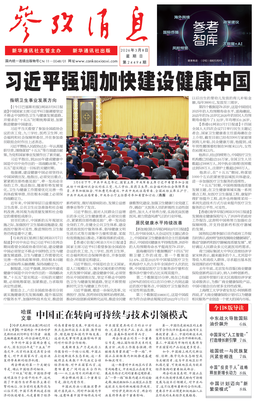 今日报纸头版:①习近平强调加快建设健康中国②哈媒文章:中国正在转向可持续与技术引领模式更多消息请关注→网页链接