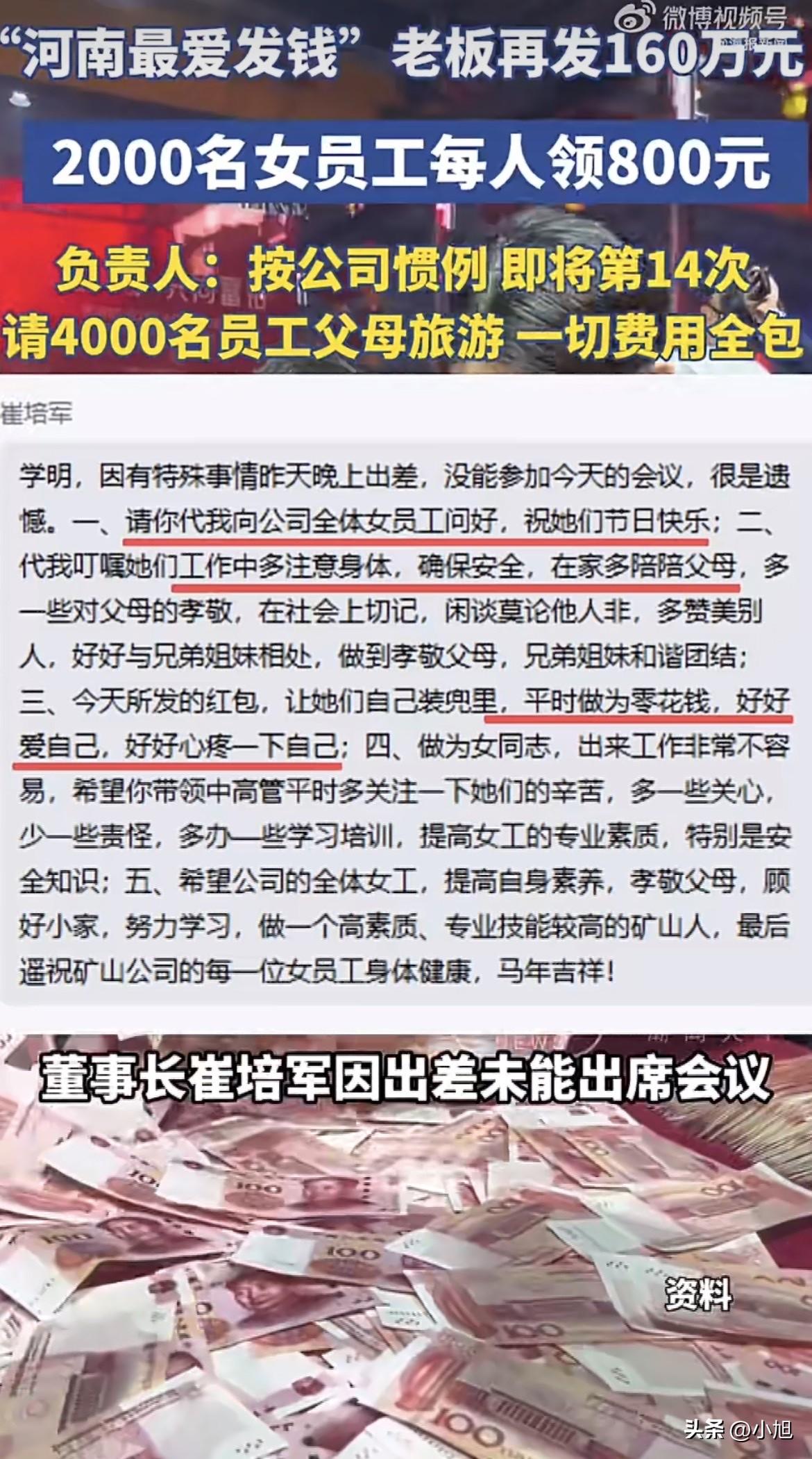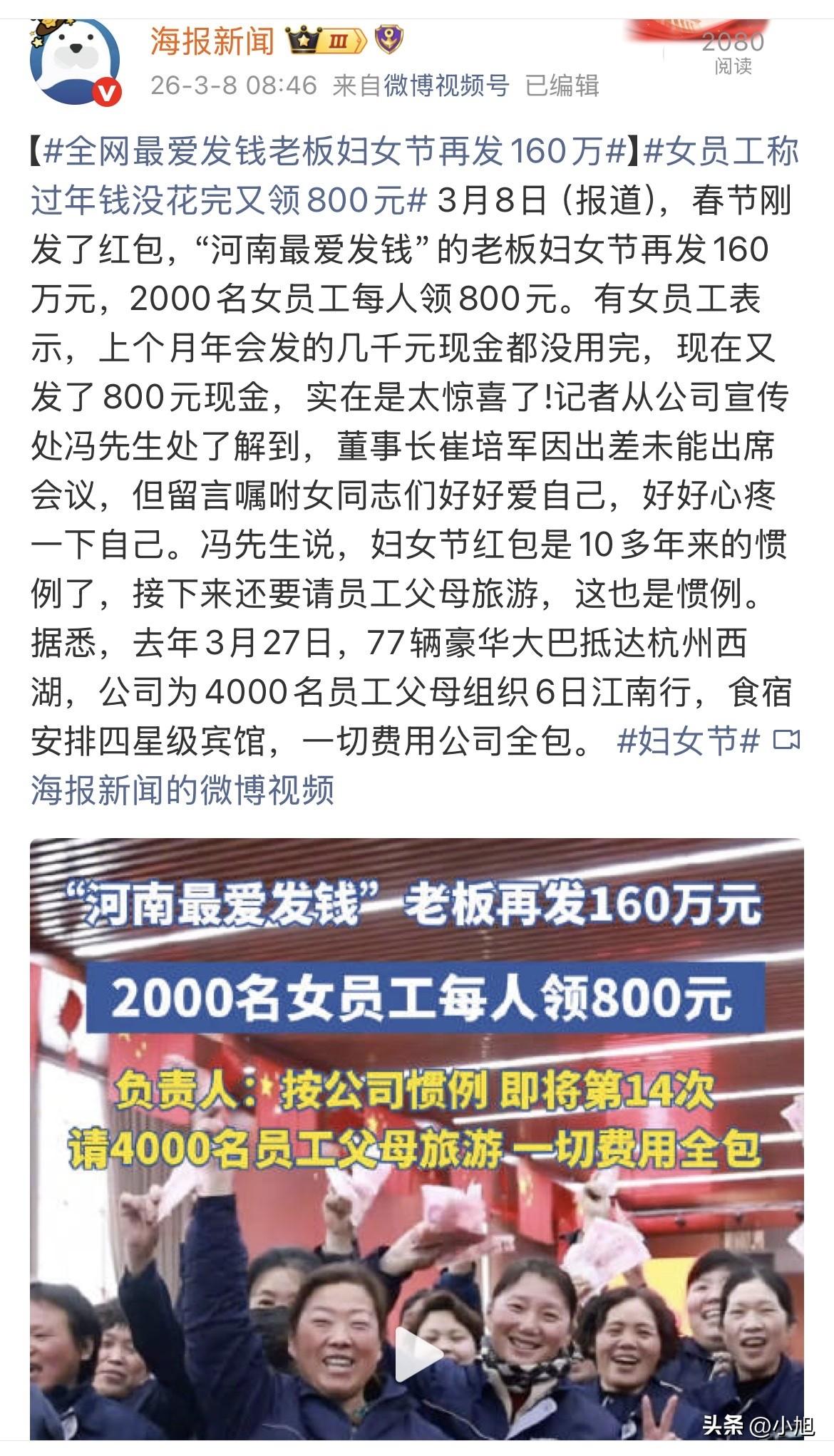 家人们谁懂啊,刚过完年兜里的钱还没用完,公司又发钱了! 3月7号上午八点半,河南矿山起重机公司的会堂里热闹得很。一年一度的三八妇女节大会正在开,台下坐了将近两千号女员工。这次老板人没到,钱到了。每人手里塞了800块现金,加起来整整160万。 有个叫林女士的员工在现场笑得合不拢嘴。她说上个月跟老公一起参加公司年会,两个人领了2100块,到现在还没花完。这下又发800,她闺女都羡慕坏了,说妈妈这班上得太幸福了。 这事在网上传开后,有人说这老板是在作秀。但仔细看看这家公司发钱的历史,从2002年开始就年年给女员工发节日红包,今年已经是第24个年头。前年每人发600,去年开始涨到800,福利标准跟着公司经营情况走,从来不落下。 这次老板崔培军人在外地出差,特意发了条短信回来交代。他说今天发的这个红包,让女同志们自己装兜里当零花钱,平时好好爱自己,好好心疼一下自己。这话从一个老板嘴里说出来,比发钱还让人觉得暖。 说起来这个崔老板确实有点意思。他发钱有个特点,不爱打卡上,就喜欢发现金。问他为啥,他说打到卡上冷冰冰的,发现金大家能见个面,互相问个好,热闹热闹。去年年会的时候,现场摆了几十台点钞机,堆了6000万现金,让员工上去数钱,数多少拿多少。有人10分钟数了9万多,数得手都抽筋。 这家公司的女员工占总人数快三分之一。崔培军说过,女同志是公司的半边天,干起活来一点不比男的差。这次妇女节发钱,有网友扒出去年公司净利润2.7个亿,给员工发了1.8亿,三分之二的利润都分出去了。 公司宣传处的冯先生说,妇女节发红包只是冰山一角。再过半个多月,公司还要请员工父母出去旅游。去年春天包了77辆豪华大巴,拉着4000多个老头老太太去杭州上海玩了6天,住四星级宾馆,吃住行全包。好多老人一辈子没出过远门,第一次坐飞机就是公司安排的。 崔培军说过一句话挺实在的。他说年轻人不容易,背着车贷房贷,压力大。能给他们减轻一点负担是一点。这话要是别的老板说,可能觉得是场面话。但看看这家公司干的事,大年初一放假、下雪天不用上班工资照发、麦收季节让员工带薪回家收麦子每人再发1000,桩桩件件都是真金白银。 有人说这老板太会了,发钱还懂得发得让人心里热乎。也有人说明明可以打卡上,非要搞这么大动静,不是作秀是什么。但底下评论区有人回了一句,这样的秀,恨不得天下老板都来作一遍。 你们觉得这样的老板多吗?