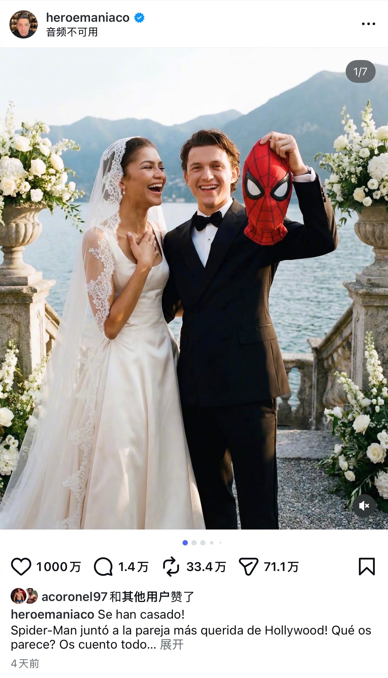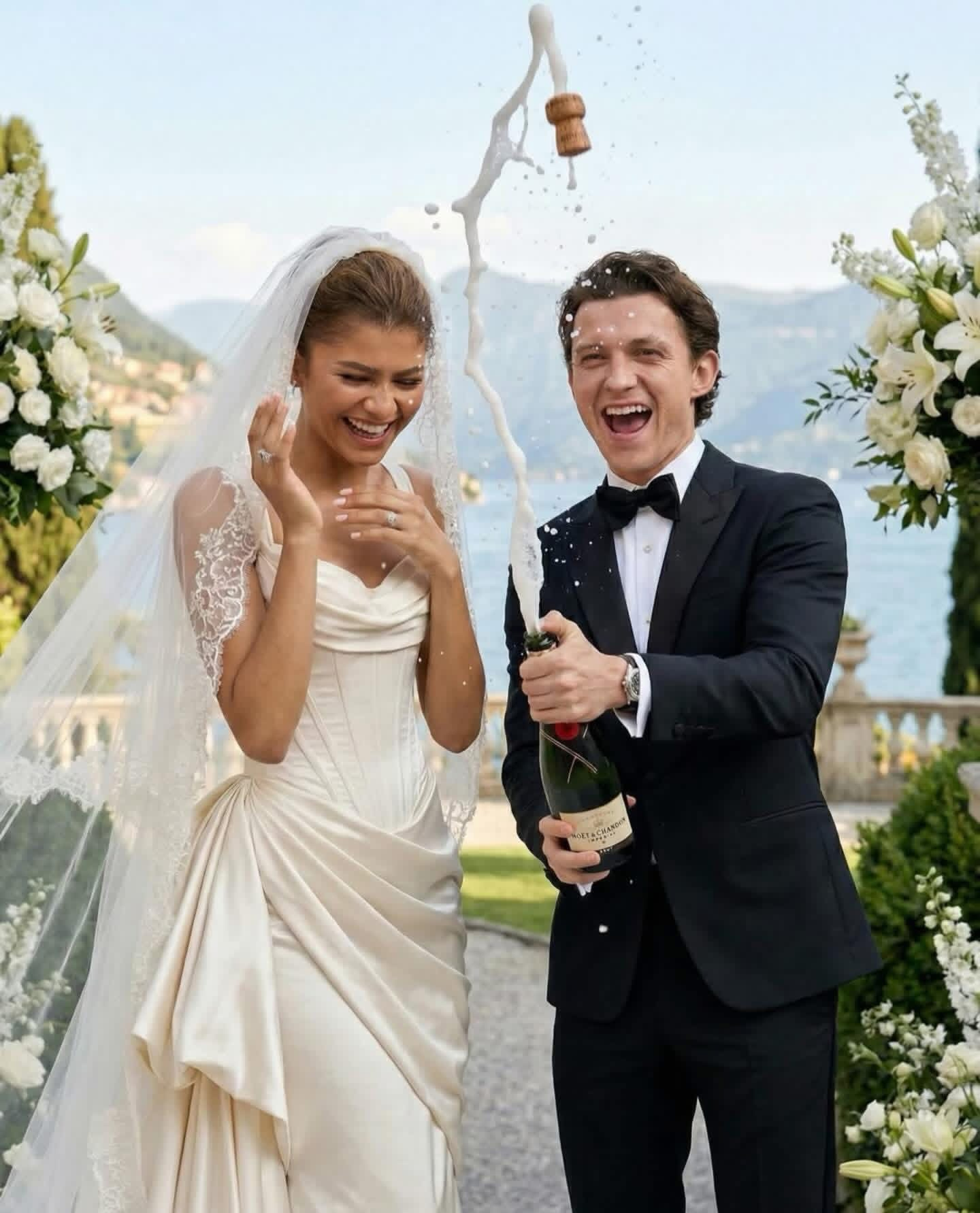 网友用AI生成荷兰弟Tom HollandheZendaya婚礼照爆红!点赞量破1000万!成为今年ins点赞量最高的帖子之一!PS:俩人已经秘密结婚,但至今未曝光官方婚礼现场图。