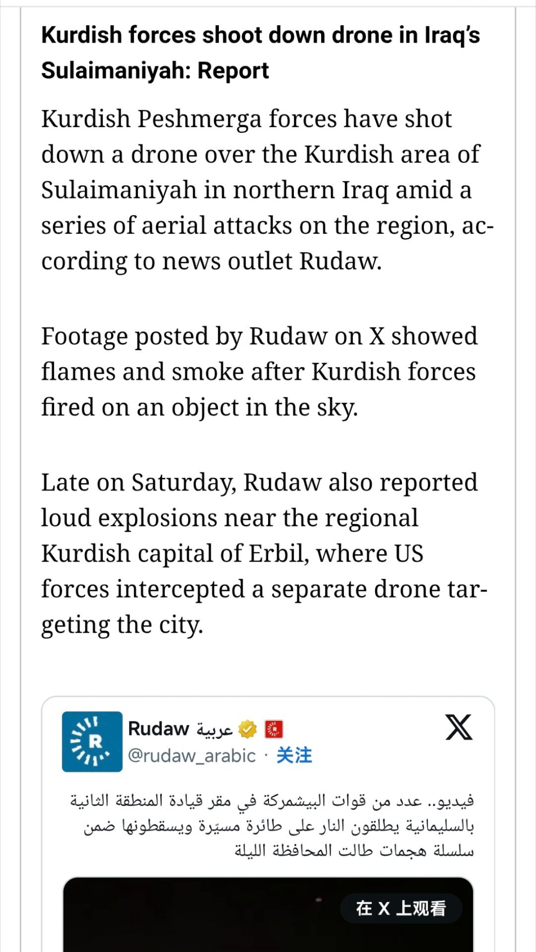 特朗普称没必要让库尔德人卷入战争¹ 但是一大早就看到新闻:库尔德地区首府受到无人机袭击!“发生巨大爆炸,美军拦截一架以该市为目标的无人机”。