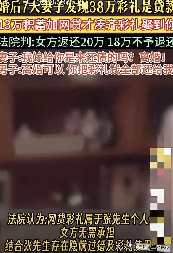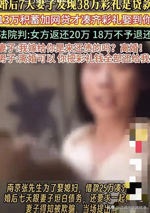“这就是骗人的下场!!!!” 江苏南京,一女子结婚7天,丈夫以为生米已经煮成了熟饭,他得意洋洋告诉女子,38万彩礼是他13万积蓄+25贷款,他话风一转,要女子和他一起还贷款,女子被骗,又气又急: 我嫁给你是来还债的吗?离婚!丈夫一听立马 变 脸: 离婚可以,你把彩礼钱全部还给我!女子告到法院,判决令人意外! 男方觉得自己掏光积蓄还背上贷款才娶到媳妇,离婚就该把钱全退回来,心里满是委屈。 女方觉得自己被刻意隐瞒真相,刚结婚就要背债,婚姻从一开始就充满欺骗,根本没法过下去。 法院审理后没有偏向任何一方,既不支持全额退彩礼,也不认可一分不退的说法。 这笔彩礼里有一部分已经用在婚礼筹备和各项开支上,这部分钱没法再返还。 男方婚前隐瞒贷款凑彩礼的事实,是婚姻破裂的主要原因,要为这段短暂婚姻承担主要责任。 25万贷款是男方婚前个人行为,不属于夫妻共同债务,女方没有义务一起偿还。 最终法院判定两人离婚,女方返还部分彩礼,剩余部分抵扣婚礼实际花费,贷款由男方自己承担。 靠隐瞒和欺骗换来的婚姻,从一开始就站不住脚,再高的彩礼也撑不起没有信任的日子。 婚恋里的真诚比什么都重要,算计和套路只会让本该美好的关系,变成两败俱伤的纠纷。骗彩礼新陷阱 女子婚姻欺骗案