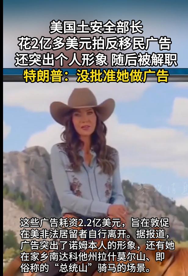 美国土安全部长花2亿拍广告,结果被解职!特朗普:我没批准! 从表面上看,诺姆的广告计划严重超支且未经批准,这无疑是对公共资源的极大浪费。2.2亿美元,可不是一笔小数目,这些资金本可用于更紧迫的边境安全项目或移民服务,却被用于一场未经授权的广告宣传,实在令人匪夷所思。诺姆在执行这一计划时,究竟是如何绕过正常的审批流程的?是她的权力过大,还是监管机制存在严重漏洞? 而广告中突出诺姆个人形象以及她骑马的场景,更是让人浮想联翩。这究竟是为了宣传政策,还是借机为自己打造个人品牌,提升政治影响力?在政治舞台上,个人形象与公共政策的界限往往模糊不清,诺姆的这一行为无疑是在这条模糊的边界上疯狂试探。她或许想通过这种方式,在民众心中树立起强硬、果断的形象,为自己的政治生涯增添筹码,但最终却适得其反。 特朗普迅速宣布诺姆改任其他职务,这一决策也值得玩味。一方面,他急于与这一未经批准的计划划清界限,避免自己受到牵连,维护自身的政治形象。另一方面,这也可能是党内权力斗争的一种体现。诺姆的行为或许触动了某些利益集团,特朗普借此机会进行调整,以平衡各方势力。 这一事件也反映出美国移民政策的混乱与矛盾。政府一方面试图通过广告等手段驱赶非法移民,另一方面却在移民政策的制定和执行上存在诸多漏洞和争议。这种矛盾的做法不仅无法有效解决问题,反而会让民众对政府的信任度降低。 诺姆的这一“神操作”,究竟是个人失策,还是美国政治生态的必然产物?