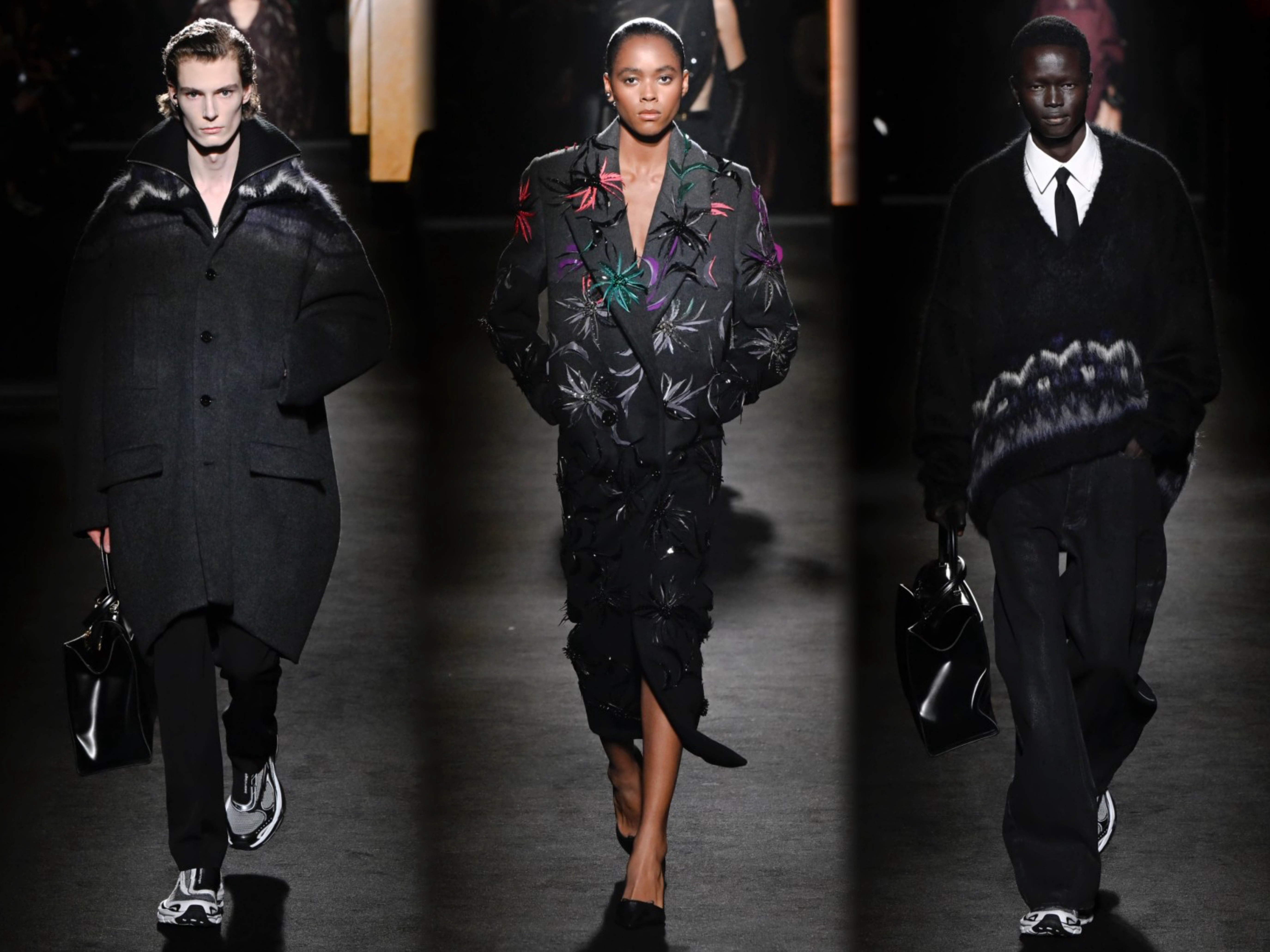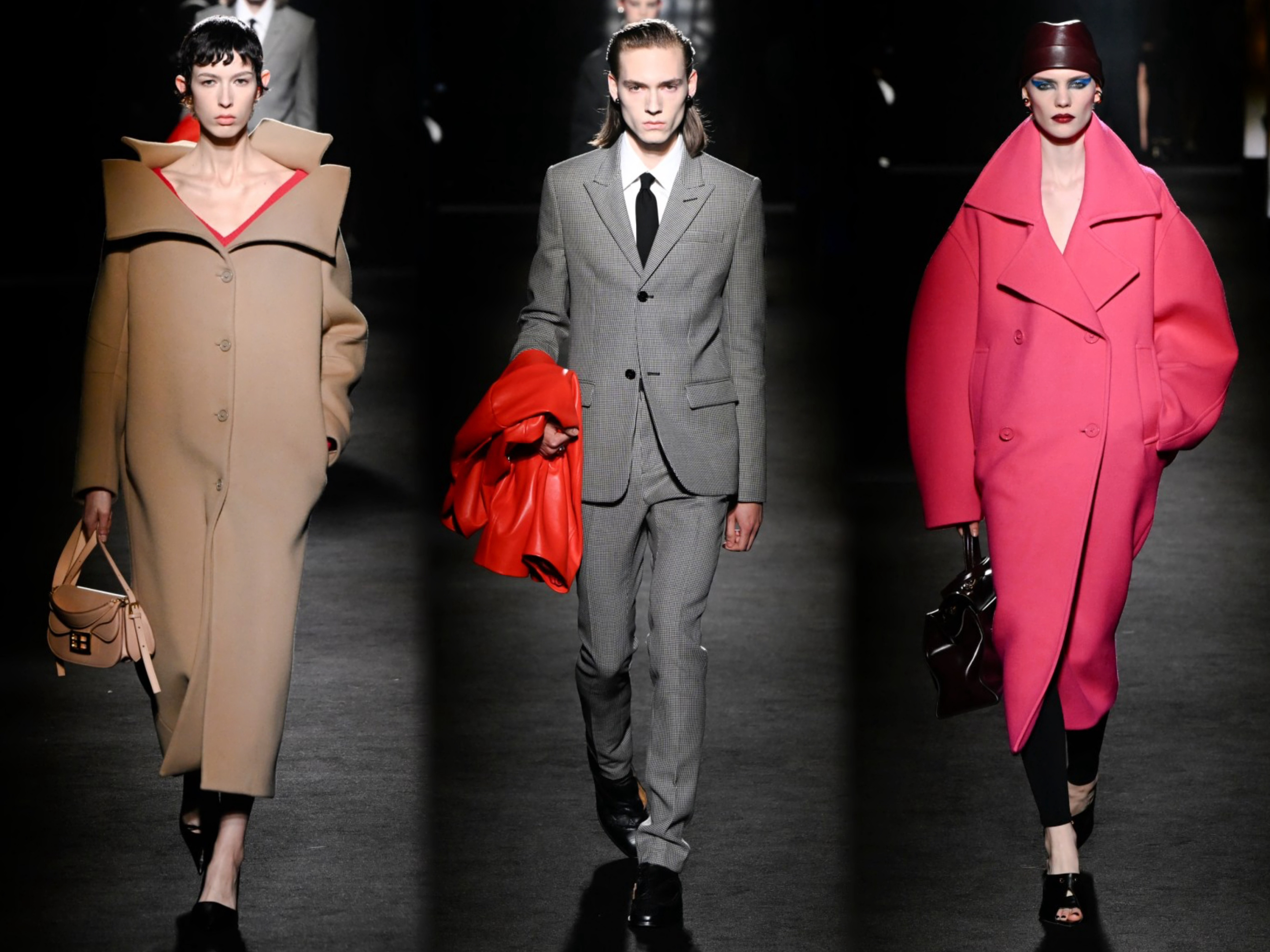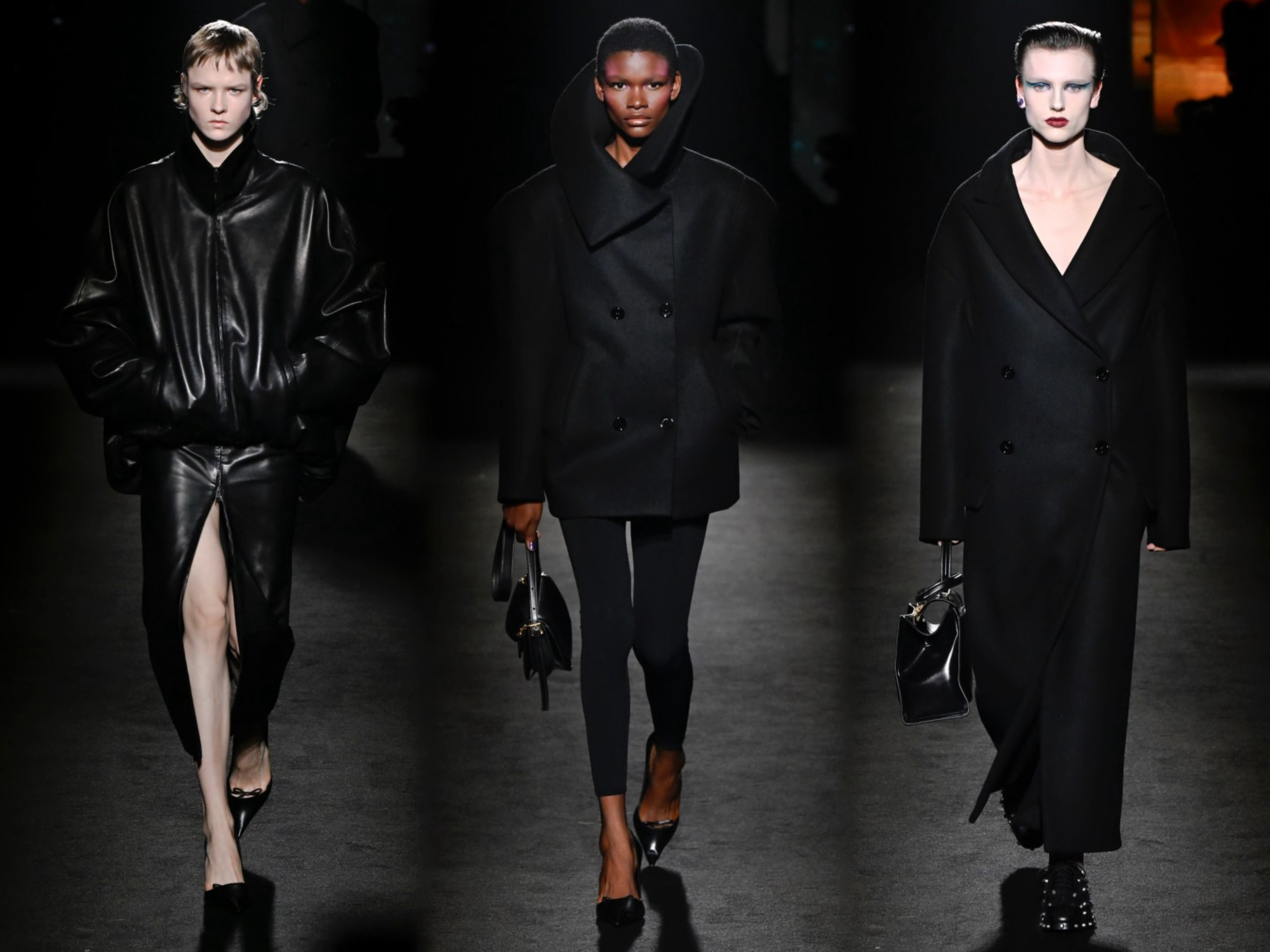 创意总监Pierpaolo Piccioli 本季主题 "ClairObscur" (光与影),以文艺复兴绘画的光影技法为灵感,聚焦光影对比的视觉表达,通过丰富多样的材质运用,融合经典设计与实穿性,弱化繁复装饰和街头符号,将茧形大衣、渐变皮草等优雅元素融入系列,从日常着装到晚装礼服,回归品牌创始人Cristóbal Balenciaga的廓形哲学。巴黎时装周直击时尚幕后