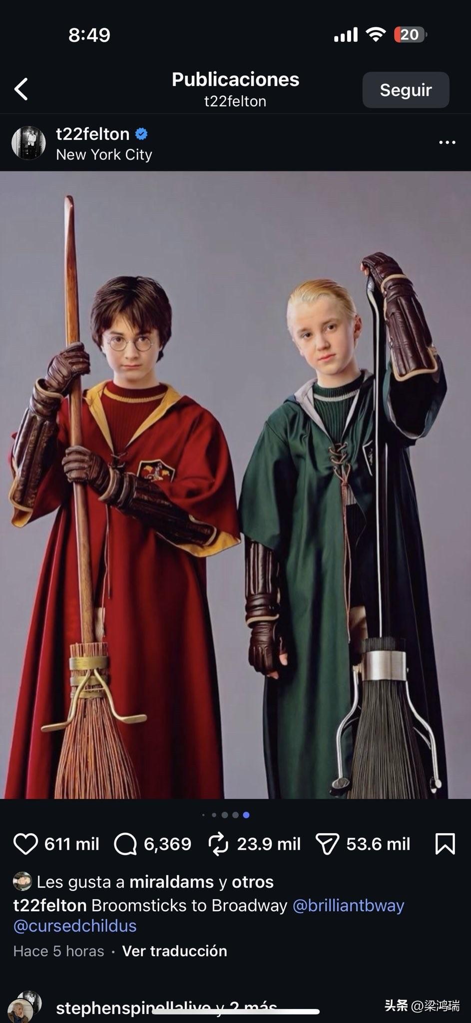 《哈利·波特》电影主演丹尼尔·雷德克里夫和汤姆·费尔顿本周在纽约百老汇重聚,两位演员分别在不同的剧目中担任主演。 这确实是一个让影迷们激动不已的“世纪重聚”! 就在本周(2026年3月初),《哈利·波特》系列中的“哈利”丹尼尔·雷德克里夫(Daniel Radcliffe)与“德拉科·马尔福”汤姆·费尔顿(Tom Felton)在纽约百老汇后台相拥合影,费尔顿还在社交媒体上配文:“从扫帚到百老汇(Broomsticks to Broadway)”。 以下是两位演员近期在百老汇的具体演出动态: 丹尼尔·雷德克里夫:主演独角戏《每一个闪耀的事物》 剧目名: 《每一个闪耀的事物》(Every Brilliant Thing) 剧场: 哈德逊剧院(Hudson Theatre) 内容: 丹尼尔在剧中饰演一名为了鼓励患有抑郁症的母亲,从小就开始列举生活中所有美好事物的男子。 档期: 该剧于2026年2月21日开始预演,计划于3月12日正式开幕,进行为期13周的限量演出,直至5月24日。 汤姆·费尔顿:回归出演《哈利·波特与被诅咒的孩子》 剧目名: 《哈利·波特与被诅咒的孩子》(Harry Potter and the Cursed Child) 剧场: 抒情剧院(Lyric Theatre) 内容: 汤姆·费尔顿重拾成名角色,在舞台上饰演成年版的德拉科·马尔福。这也是他首次在百老汇舞台上出演此角色。 档期: 费尔顿的本轮演出将持续至2026年5月10日。 据悉,汤姆·费尔顿在接受采访时曾提到,正是丹尼尔多年来在百老汇的成功转型给了他很大的鼓舞,促使他决定来到纽约尝试舞台剧。 此次重聚正是费尔顿前往哈德逊剧院探班丹尼尔时发生的,两人的深情拥抱也让许多看着该系列长大的粉丝直呼“回忆杀”。