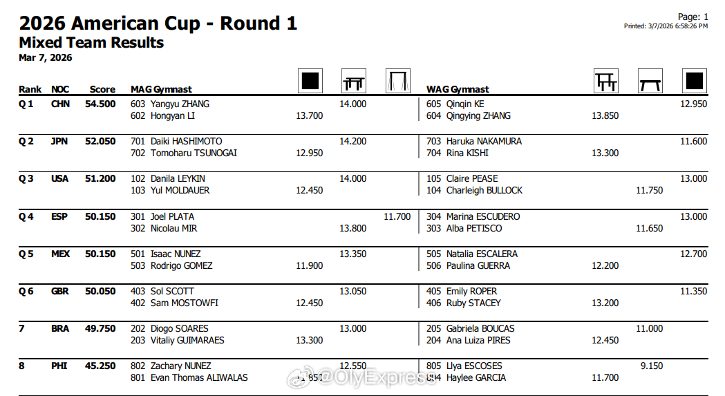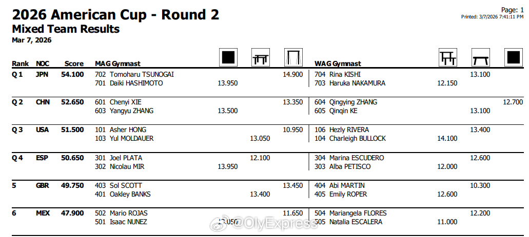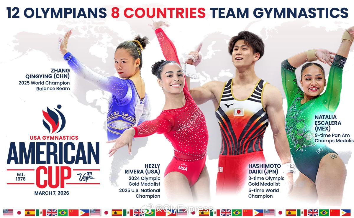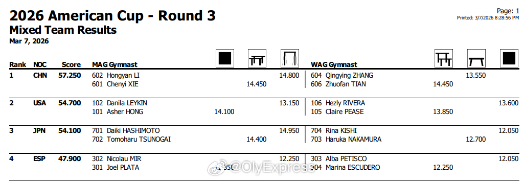 【美国杯体操赛中国夺冠 奥运混团赛制首试水】国际体坛战报速递3月7日拉斯维加斯,2026年美国杯体操混合团体赛结束,中国队以57.250分夺得冠军,美国和桥本大辉领衔的日本(男女各2人)分获银铜牌。体操混团是洛杉矶奥运会新设项目,这是全新赛制首次亮相。本次比赛共有8支队伍参赛,比赛项目为男子自由体操、双杠和单杠,女子自由体操、平衡木和高低杠。根据规则,每队最多派出男女各3名选手参加三轮比赛,每轮男女各两人出战。第一轮前六名晋级第二轮,第二轮前四名晋级奖牌轮,各轮比分不带入下一轮。每轮每队两名选手不能选择同一单项,每名选手三轮比赛项目不能相同,且三轮比赛每个单项都必须有2人参赛。中国队每轮详细比分如下:第一轮:54.500,第一柯沁沁/李鸿颜:自由操12.950+13.700张清颖/张杨煜:高低杠/双杠13.850+14.000第二轮:52.650,第二柯沁沁/谢晨屹:平衡木/单杠13.100+13.350张清颖/张杨煜:自由操12.700+13.500奖牌轮:57.250,冠军田倬凡/谢晨屹:高低杠/双杠14.450+14.450张清颖/李鸿颜:平衡木/单杠13.550+14.800